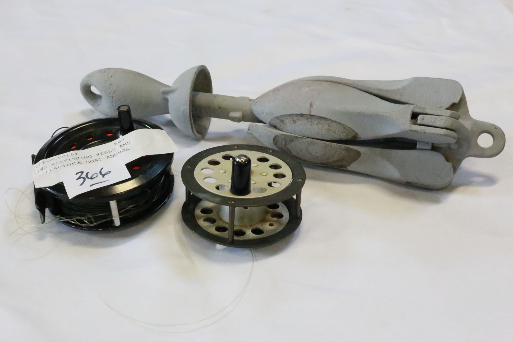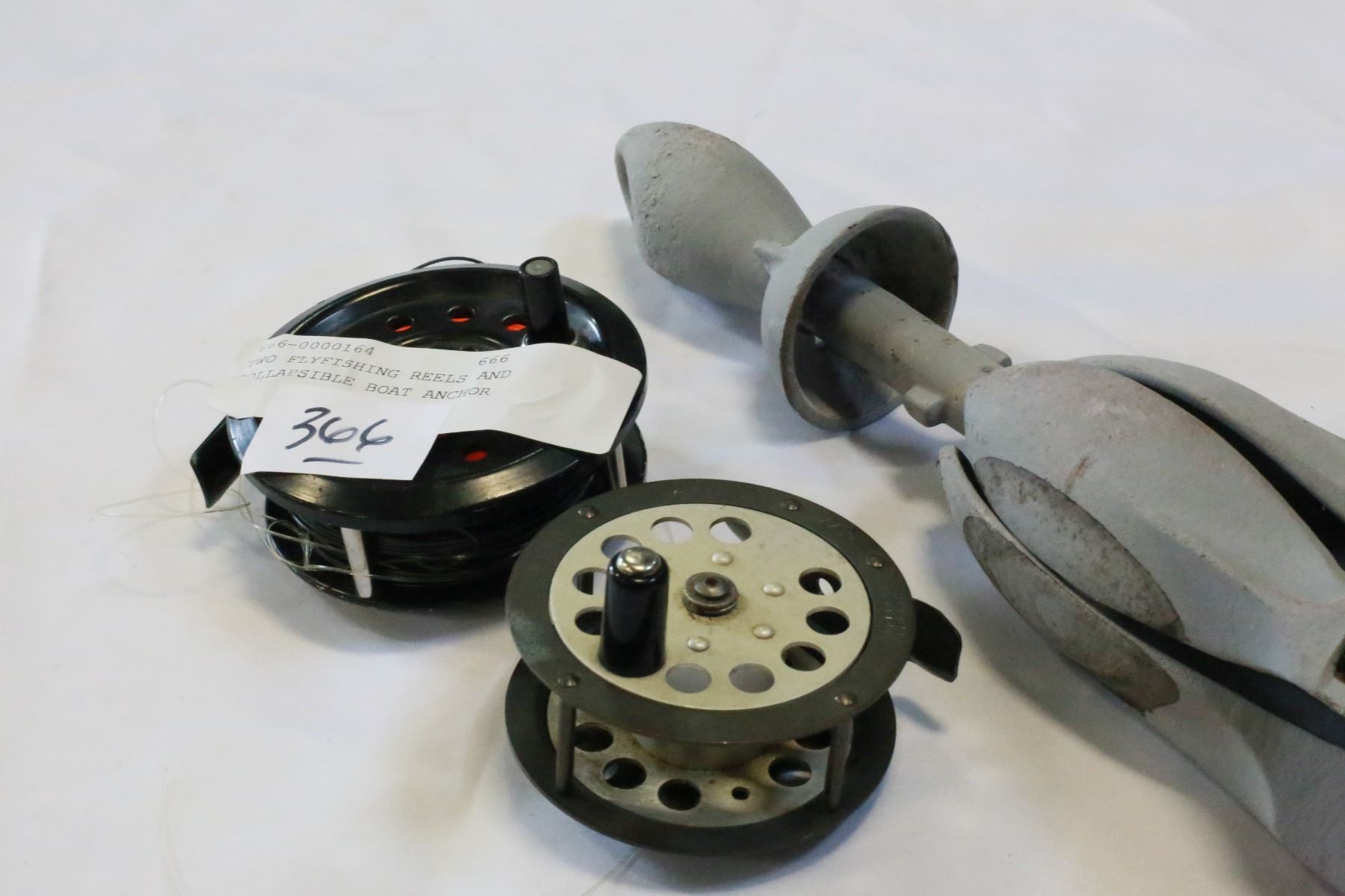 TWO FLYFISHING REELS AND COLLAPSIBLE BOAT ANCHOR