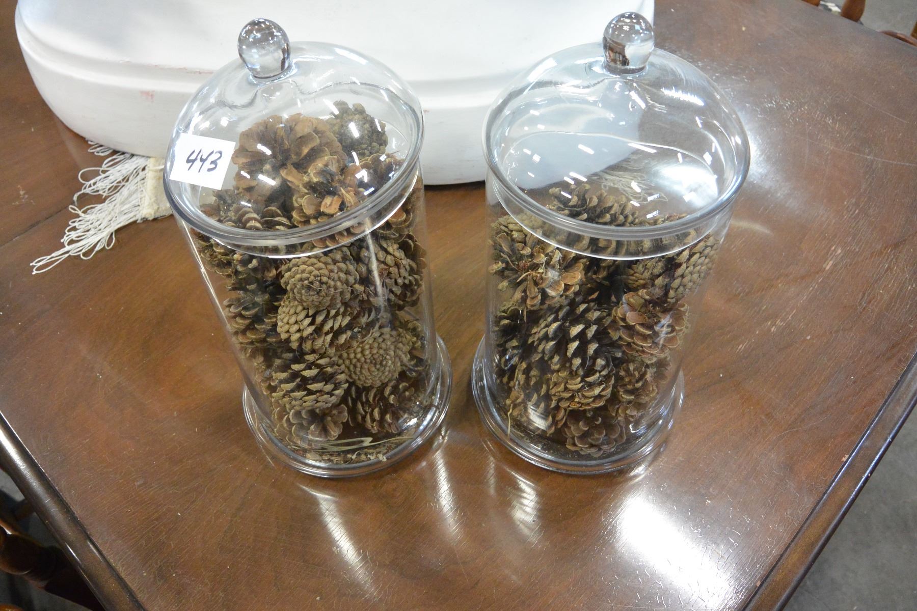 TWO GLASS LIDDED CONTAINERS WITH DECORATIVE PINECONES