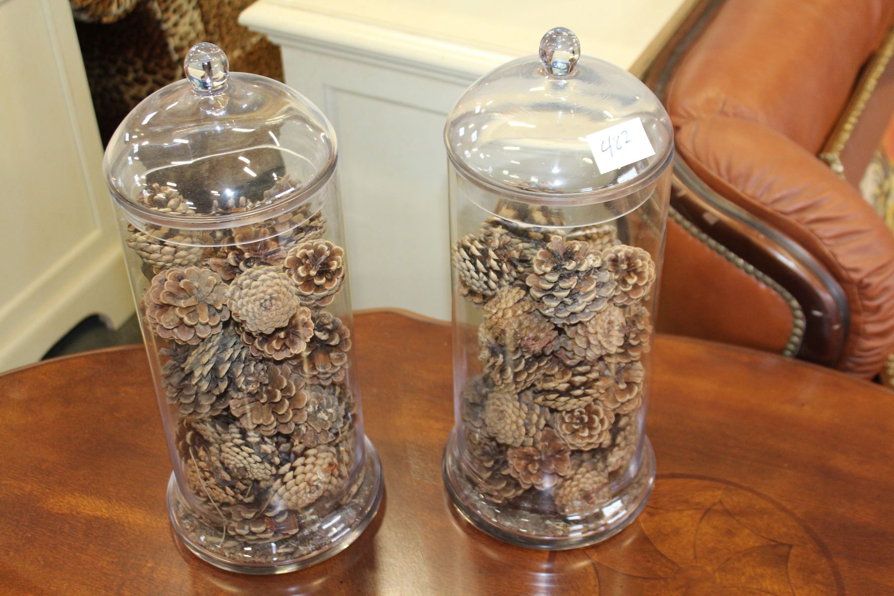 TWO GLASS LIDDED CONTAINERS WITH DECORATIVE PINECONES