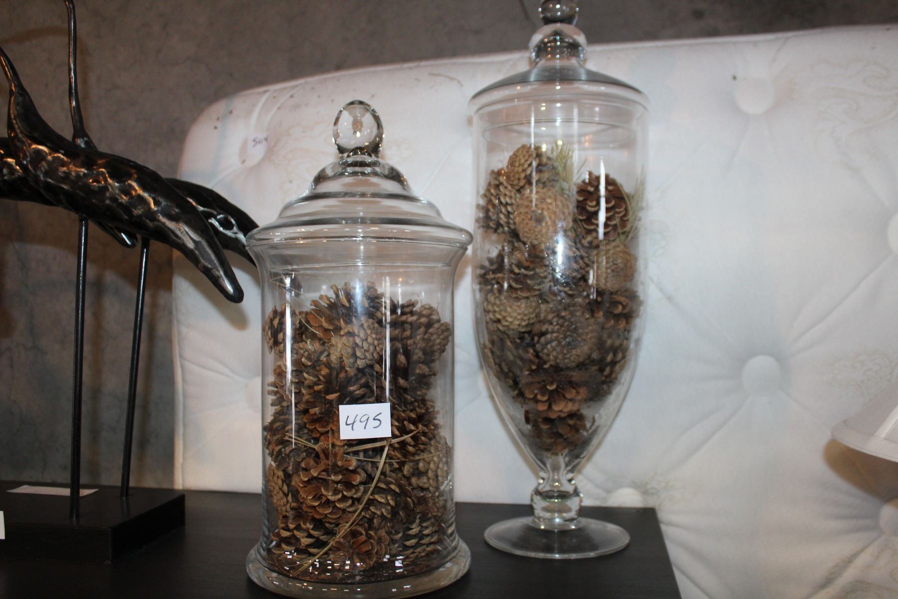 TWO GLASS LIDDED CONTAINERS WITH DECORATIVE PINECONES