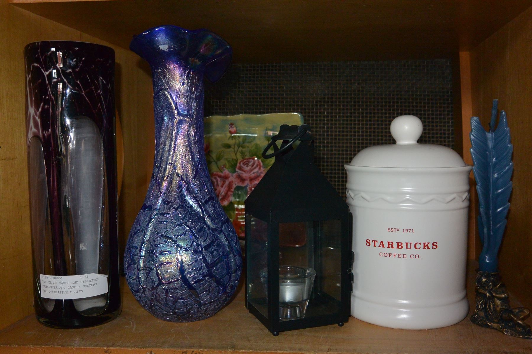 TWO GLASS VASES AND STARBUCKS CANNISTER AND CANDLE HOLDERS AND DECORATIVE PLATES