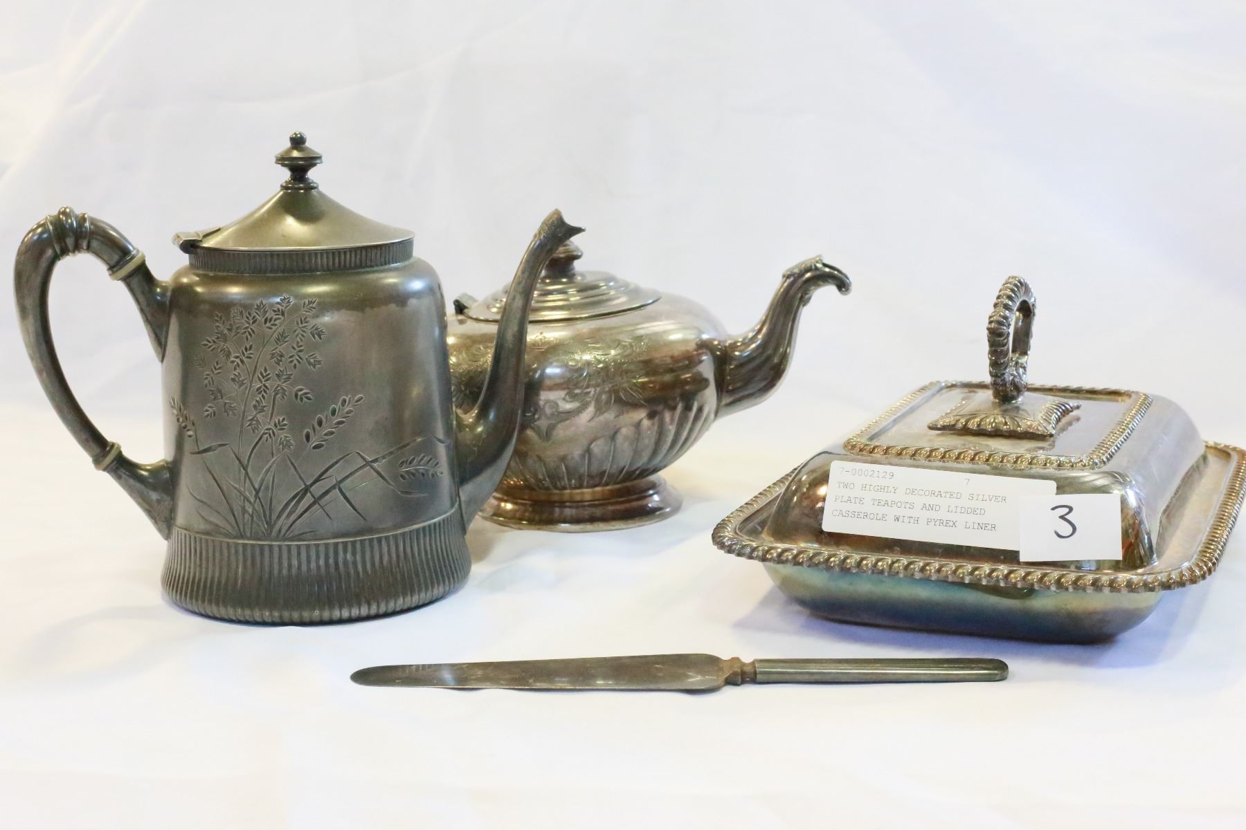 TWO HIGHLY DECORATED SILVER PLATE TEAPOTS AND LIDDED CASSEROLE WITH PYREX LINER