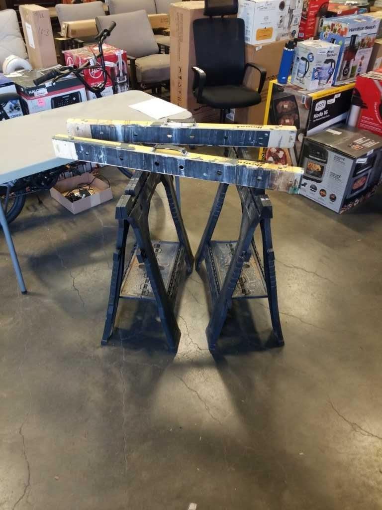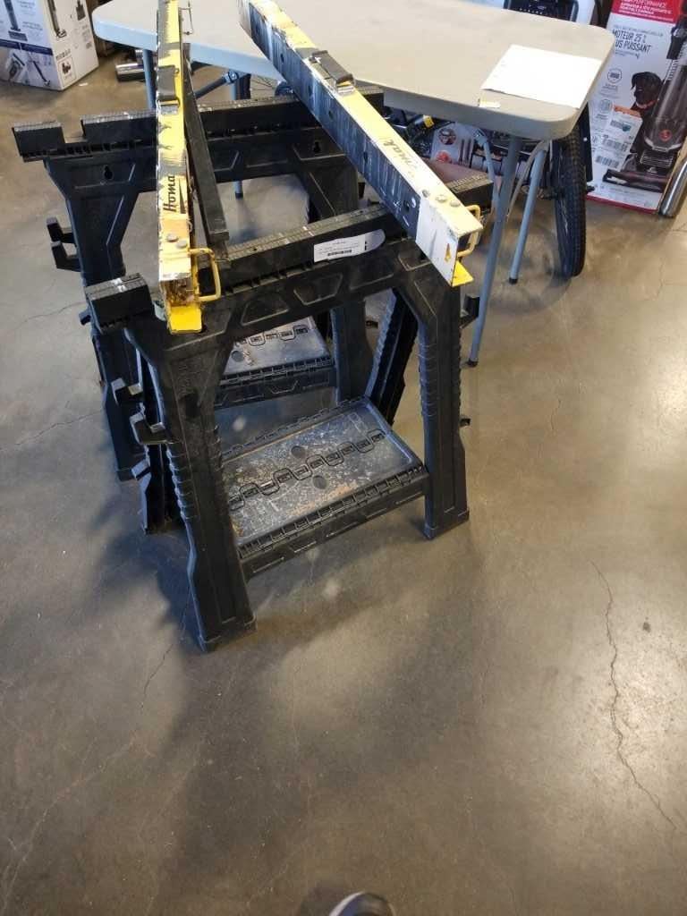 TWO HOMAK FOLDING METAL SAW HORSES AND 2 PLASTIC SAW HORSES