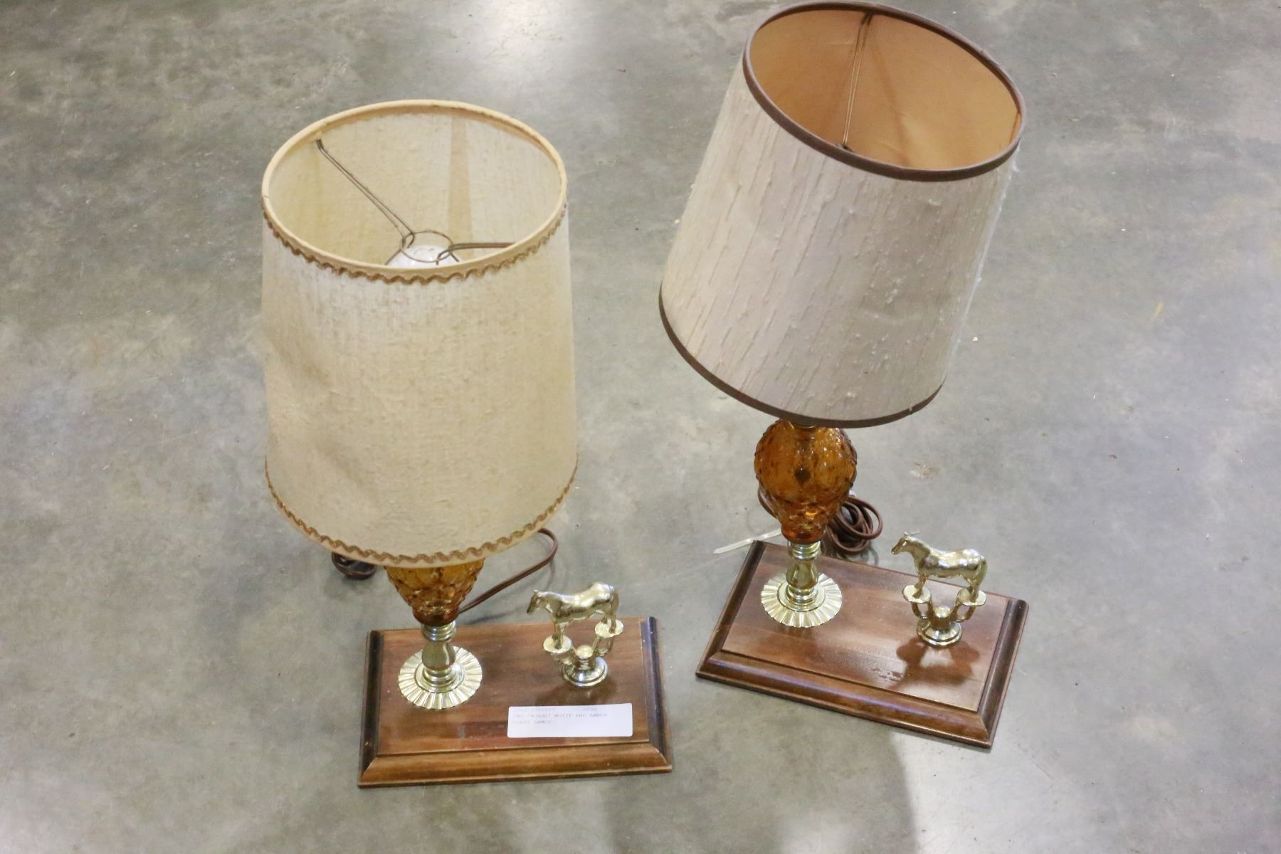 TWO HORSE MOTIF AND AMBER GLASS LAMPS