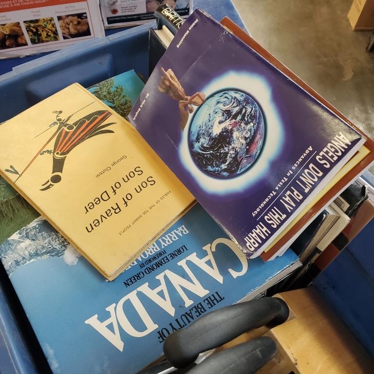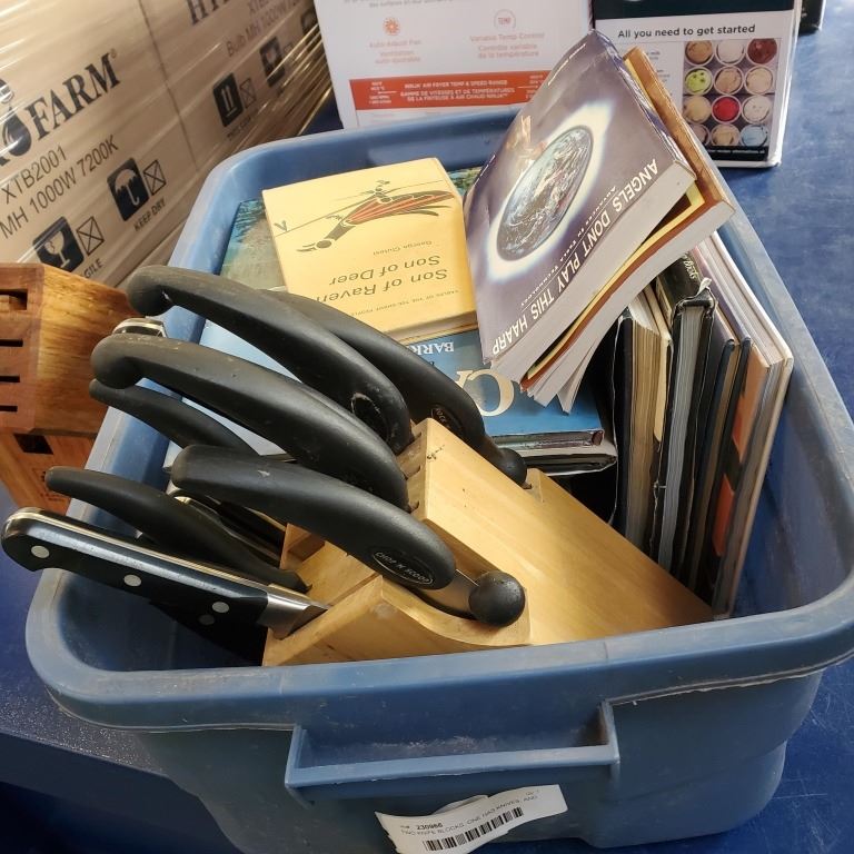 TWO KNIFE BLOCKS, ONE HAS KNIVES, AND ASSORTED COLLECTOR AND HARD COVER BOOKS