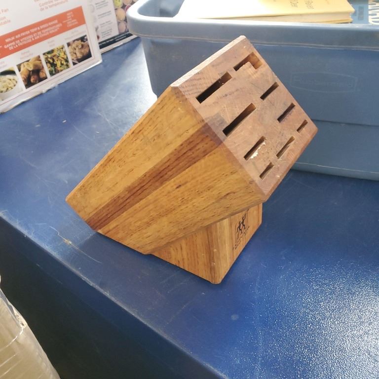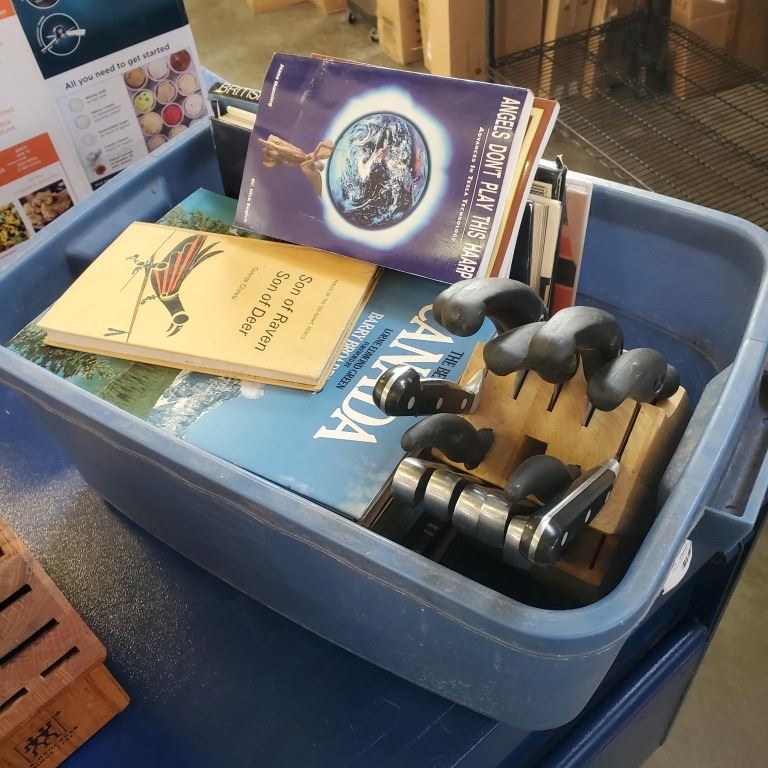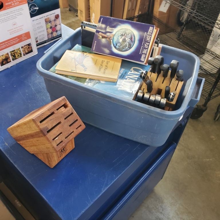 TWO KNIFE BLOCKS, ONE HAS KNIVES, AND ASSORTED COLLECTOR AND HARD COVER BOOKS