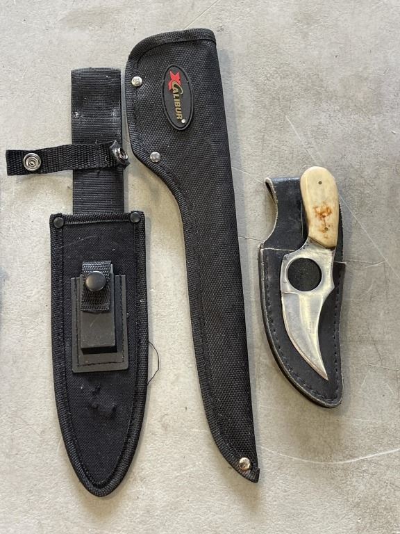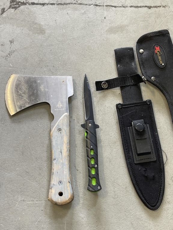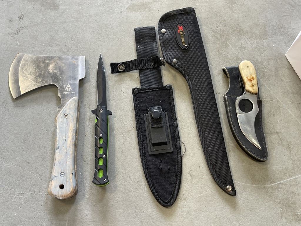 TWO KNIFE SHEATHS, TWO KNIVES WITH SHEATHS AND AXE