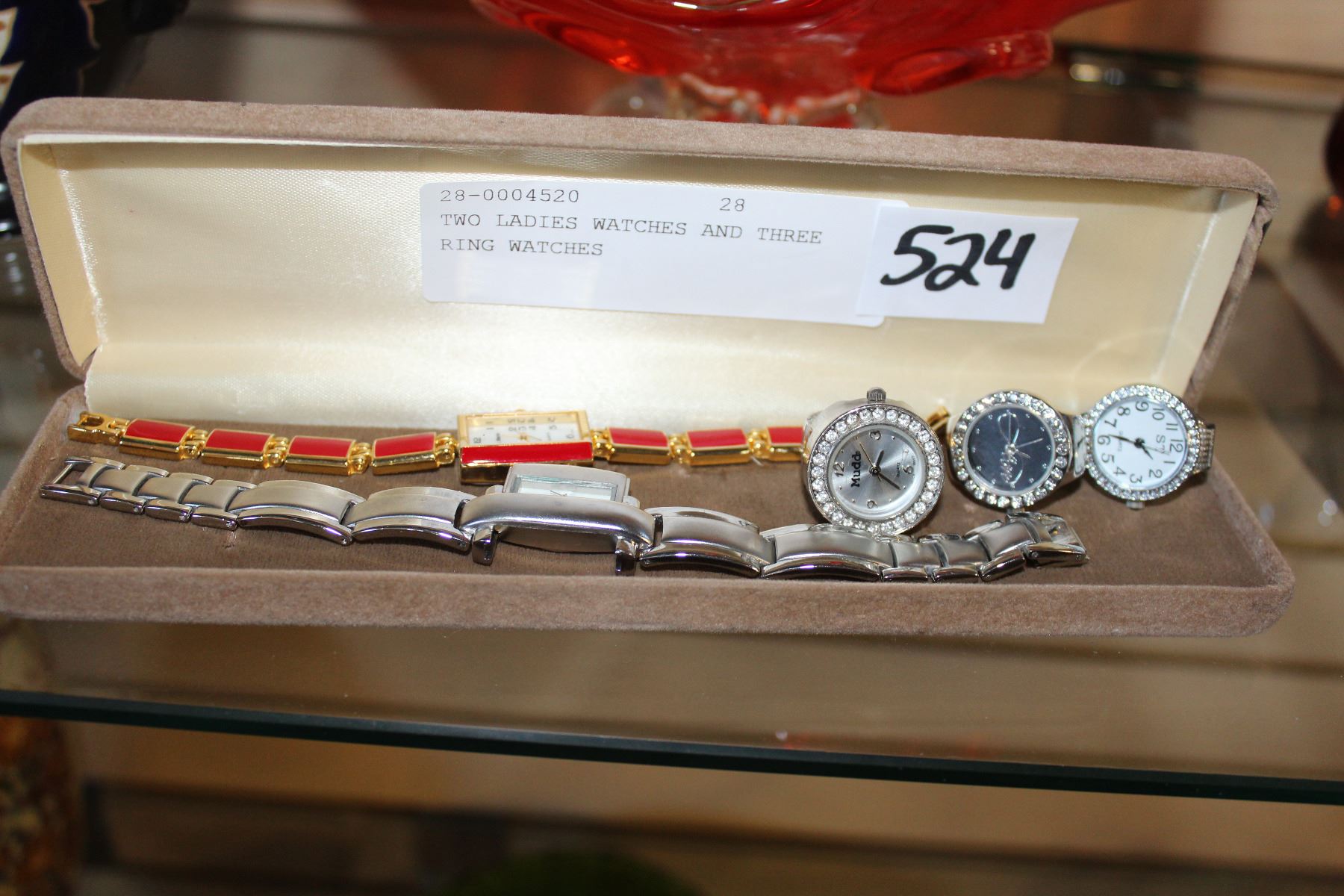 TWO LADIES WATCHES AND THREE RING WATCHES
