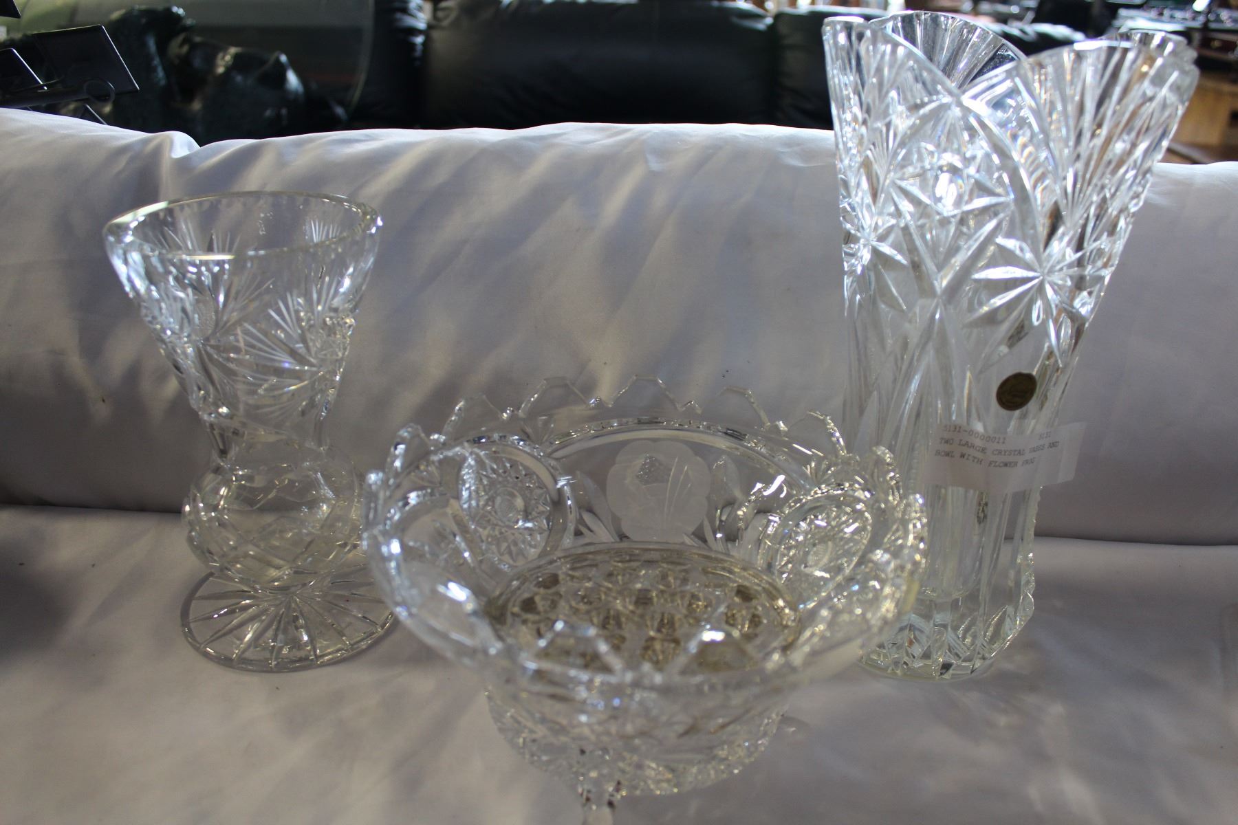 TWO LARGE CRYSTAL VASES AND BOWL WITH FLOWER FROG