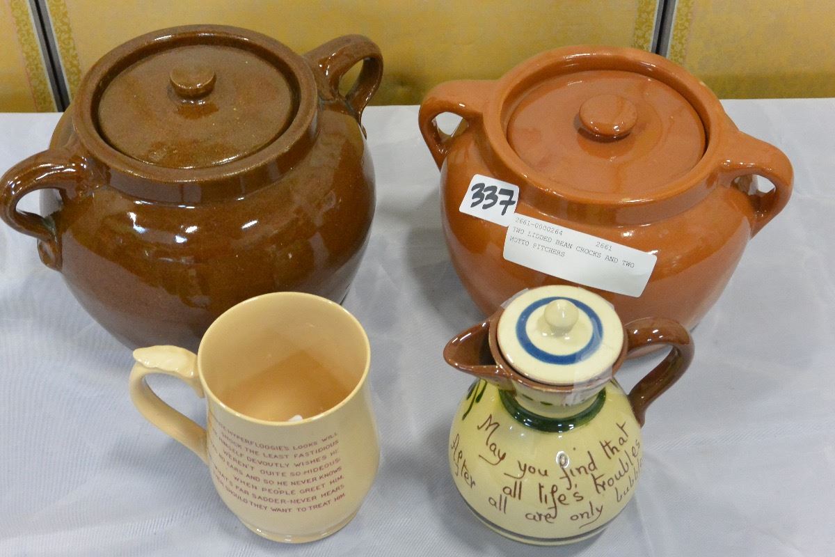 TWO LIDDED BEAN CROCKS AND TWO MOTTO PITCHERS
