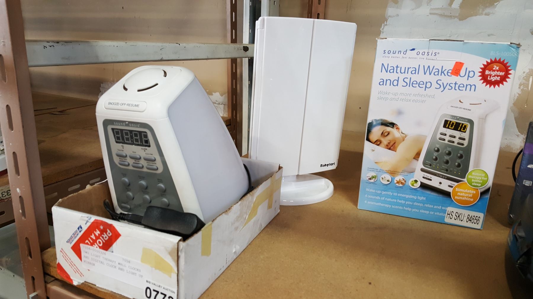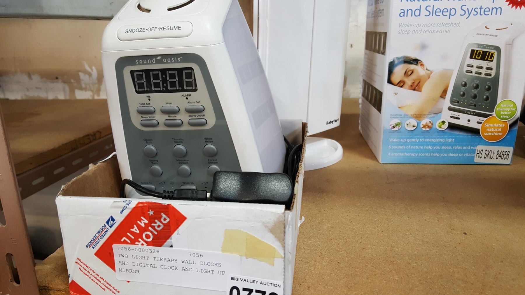 TWO LIGHT THERAPY WALL CLOCKS AND DIGITAL CLOCK AND LIGHT UP MIRROR