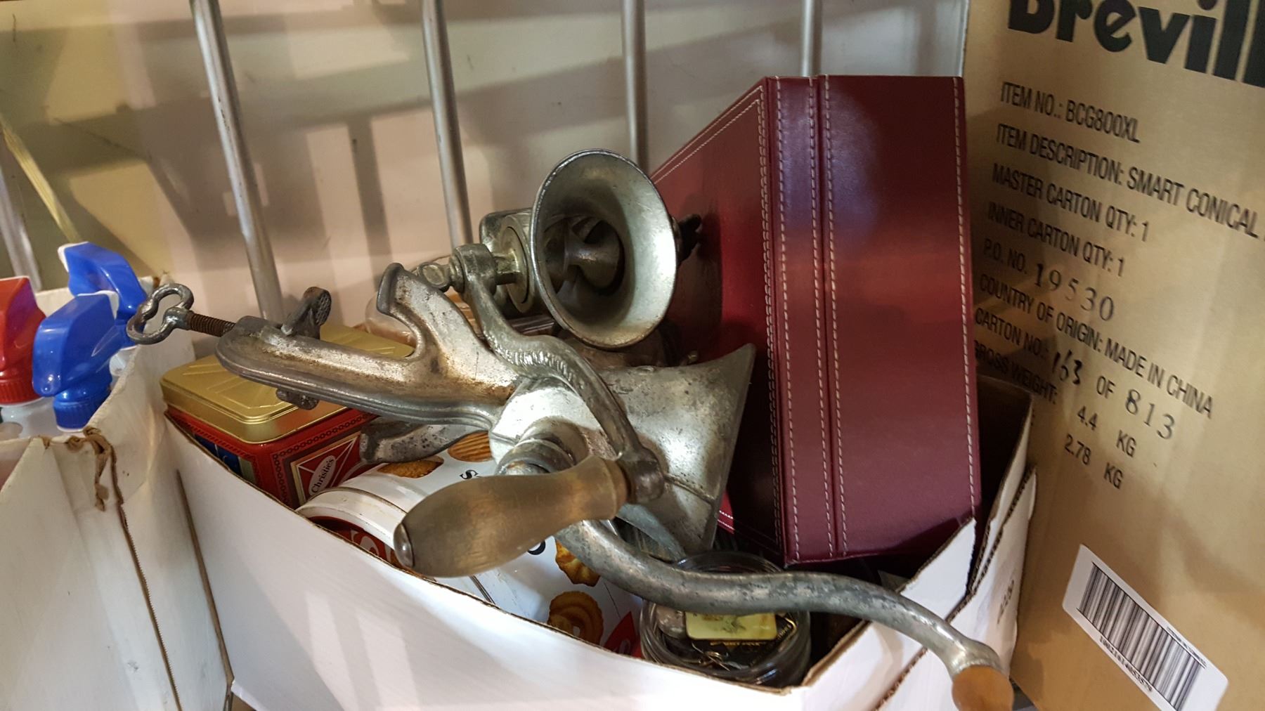 TWO MEAT GRINDERS AND BOX OF KEYCHAINS AND COLLECTIBLES
