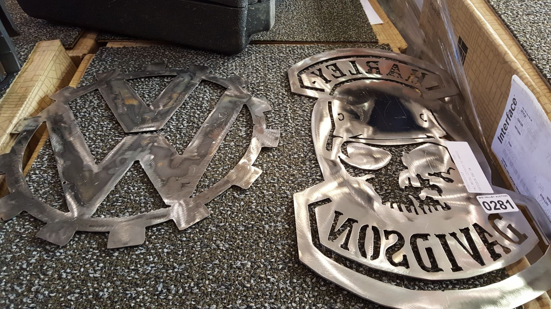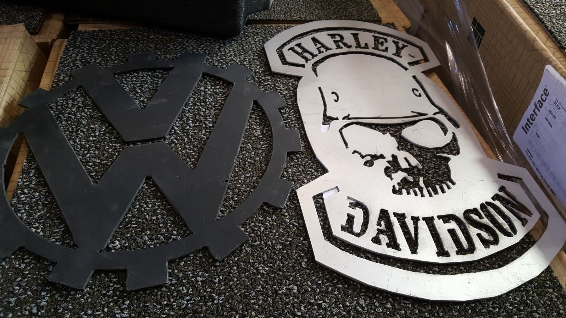 TWO METAL CUTOUTS OF HARLEY DAVIDSON AND VW