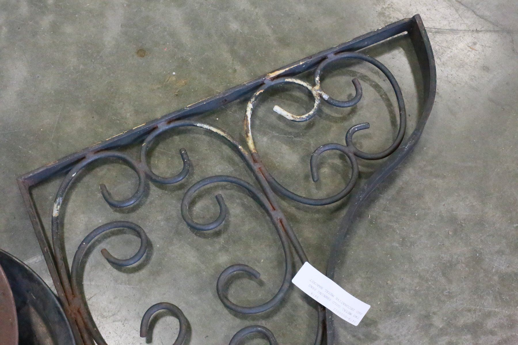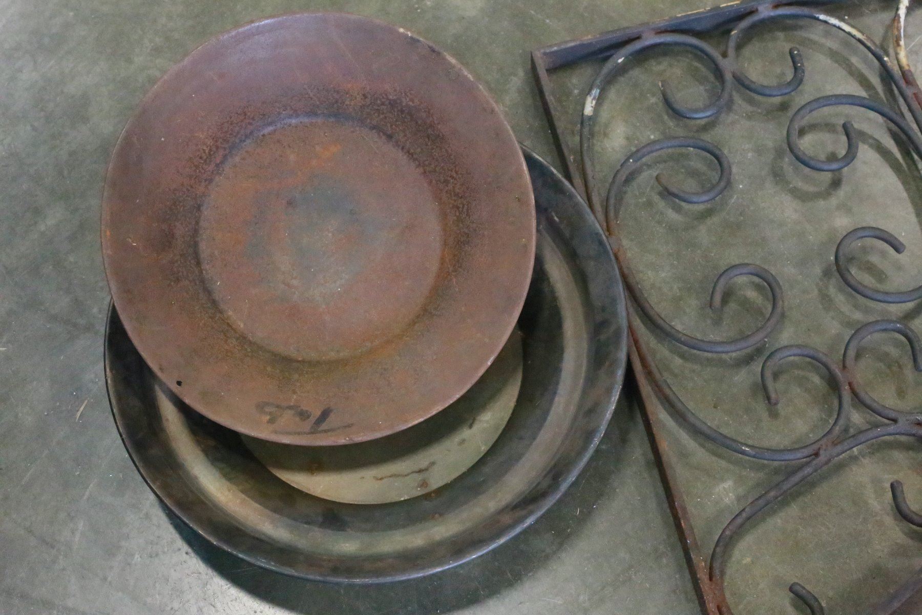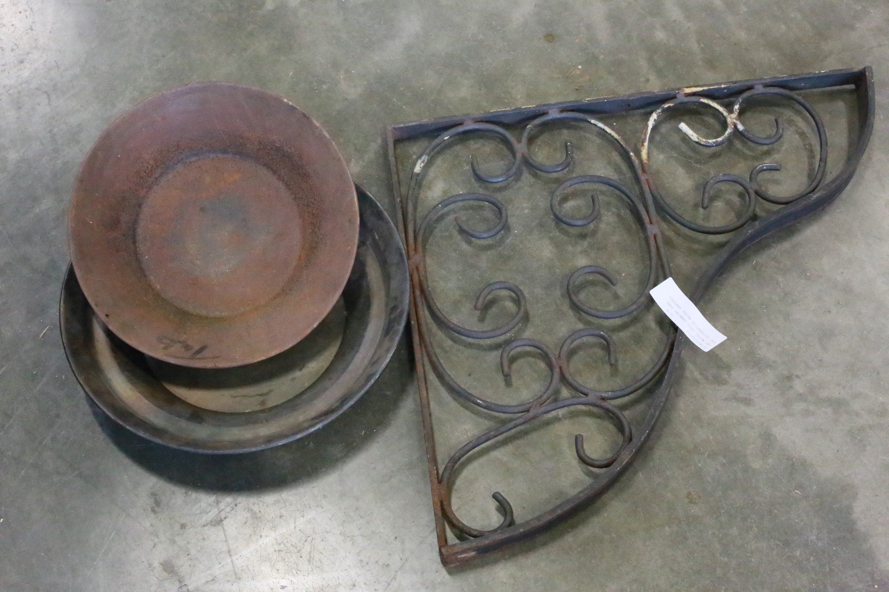 TWO METAL GOLD PANNING PANS AND DECORATIVE METAL BRACKET