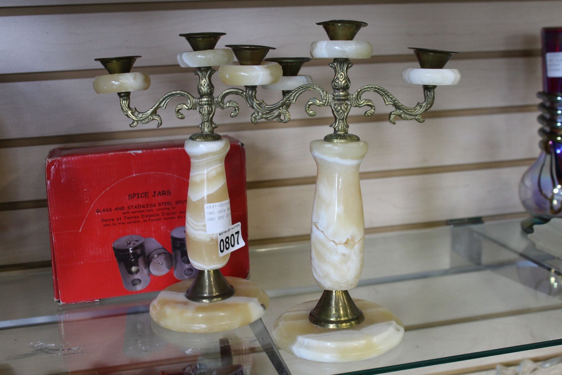 TWO ONYX AND BRASS CANDLEABRAS AND SET OF NEW SPICE JARS