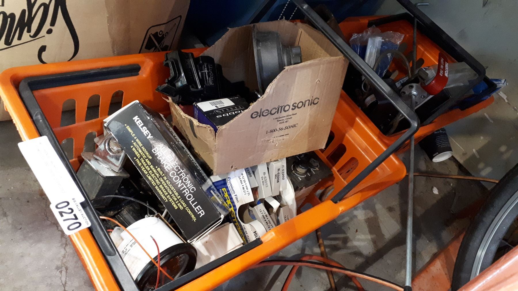 TWO ORANGE BASKETS OF AUTOMOTIVE AND SHOP SUPPLIES