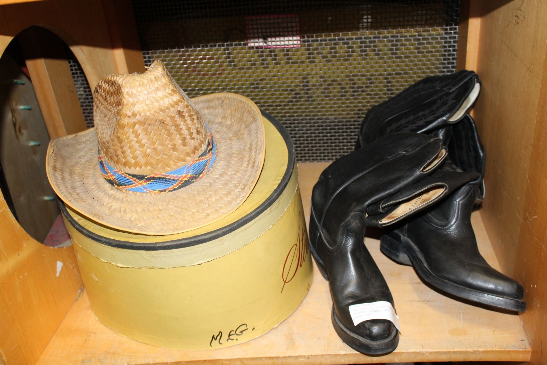TWO PAIR OF BALCK LEATHER BOULET COWBOY BOOTS AND STRAW LAMP