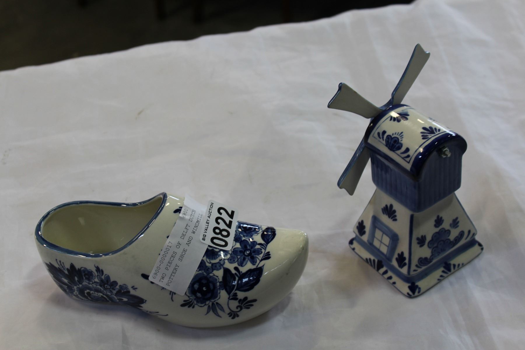 TWO PIECES OF DELFT DUTCH POTTERY SHOE AND WINDMILL