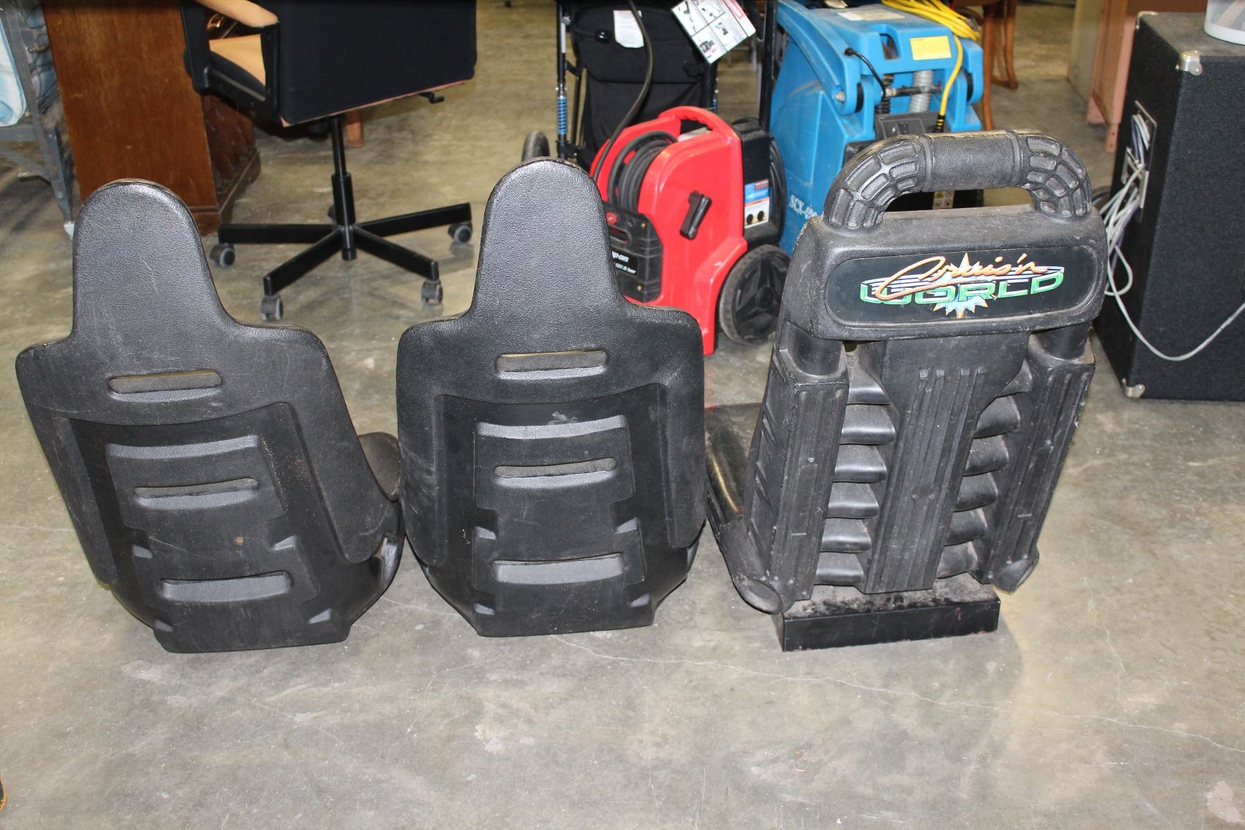 TWO PLASTIC BUCKET SEATS AND CRUSIN WORLD ARCADE SEAT