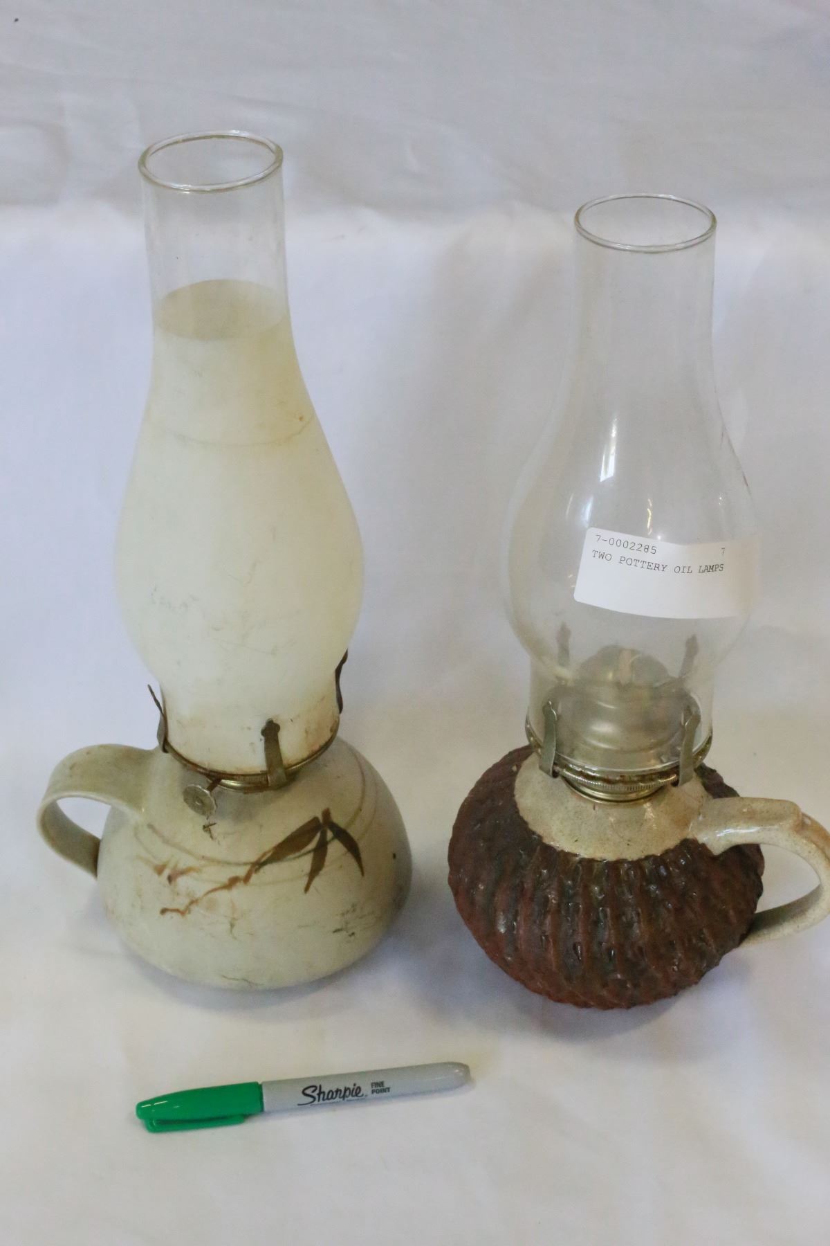 TWO POTTERY OIL LAMPS
