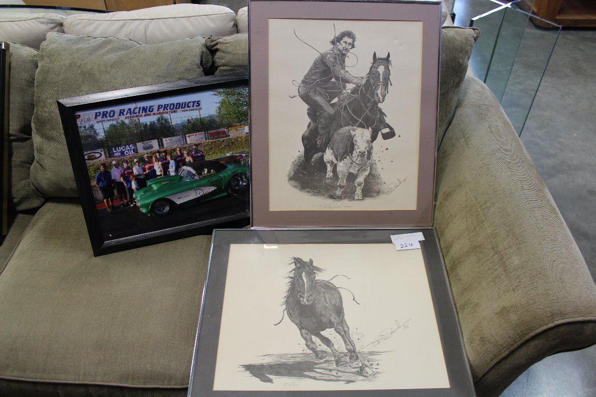 TWO PRINTS OF DRAWINGS AND NASCAR PRINT