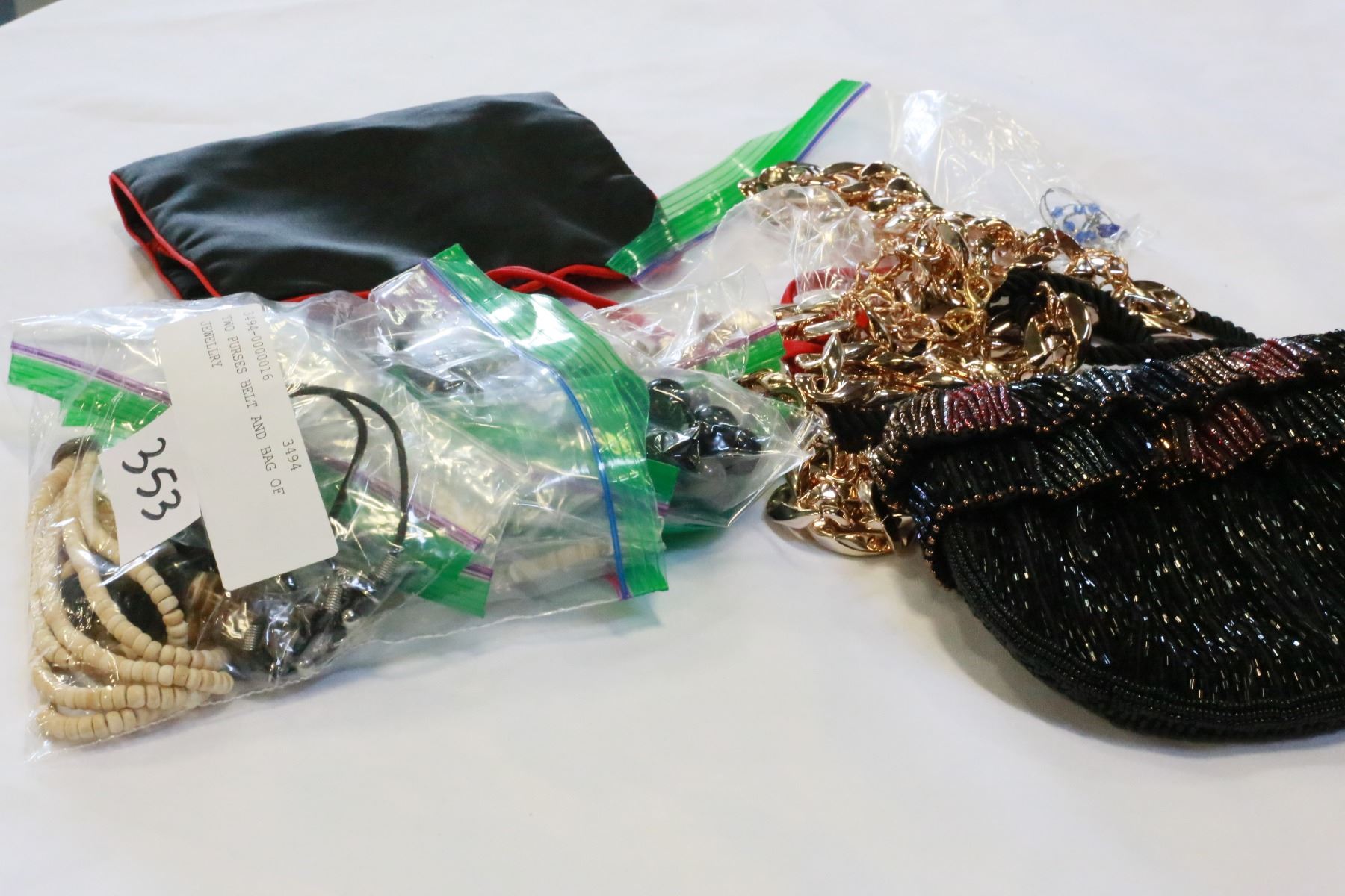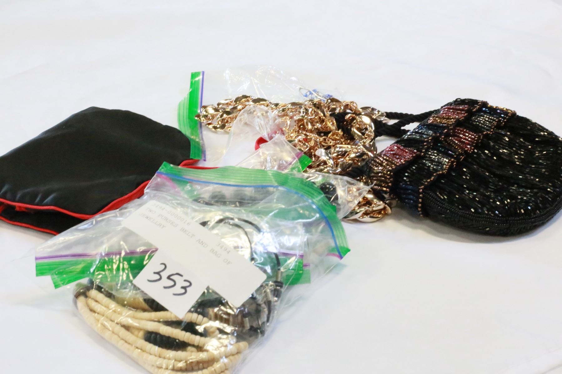 TWO PURSES BELT AND BAG OF JEWELLRY