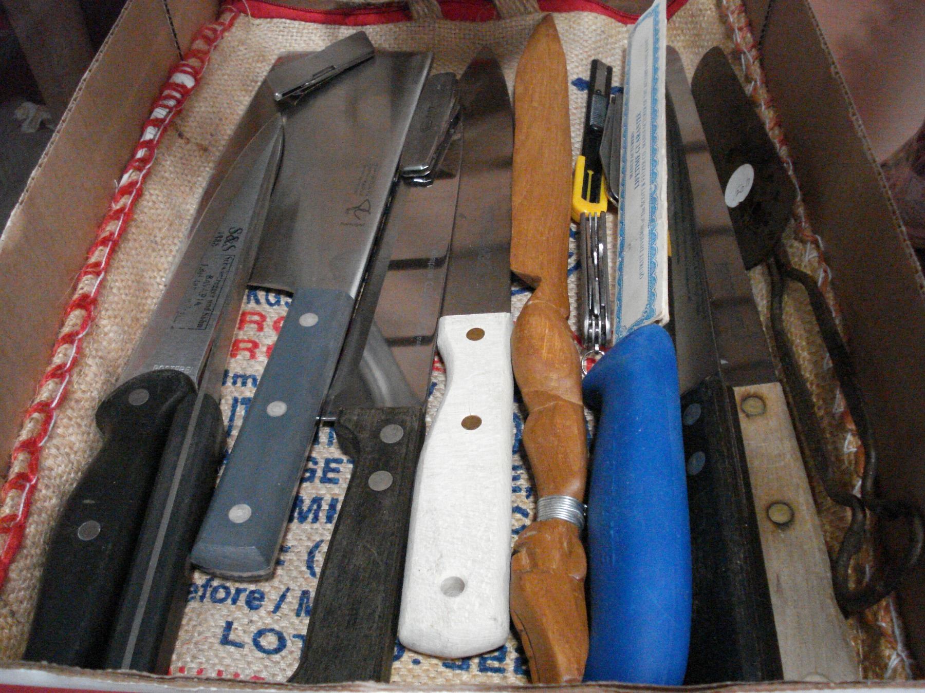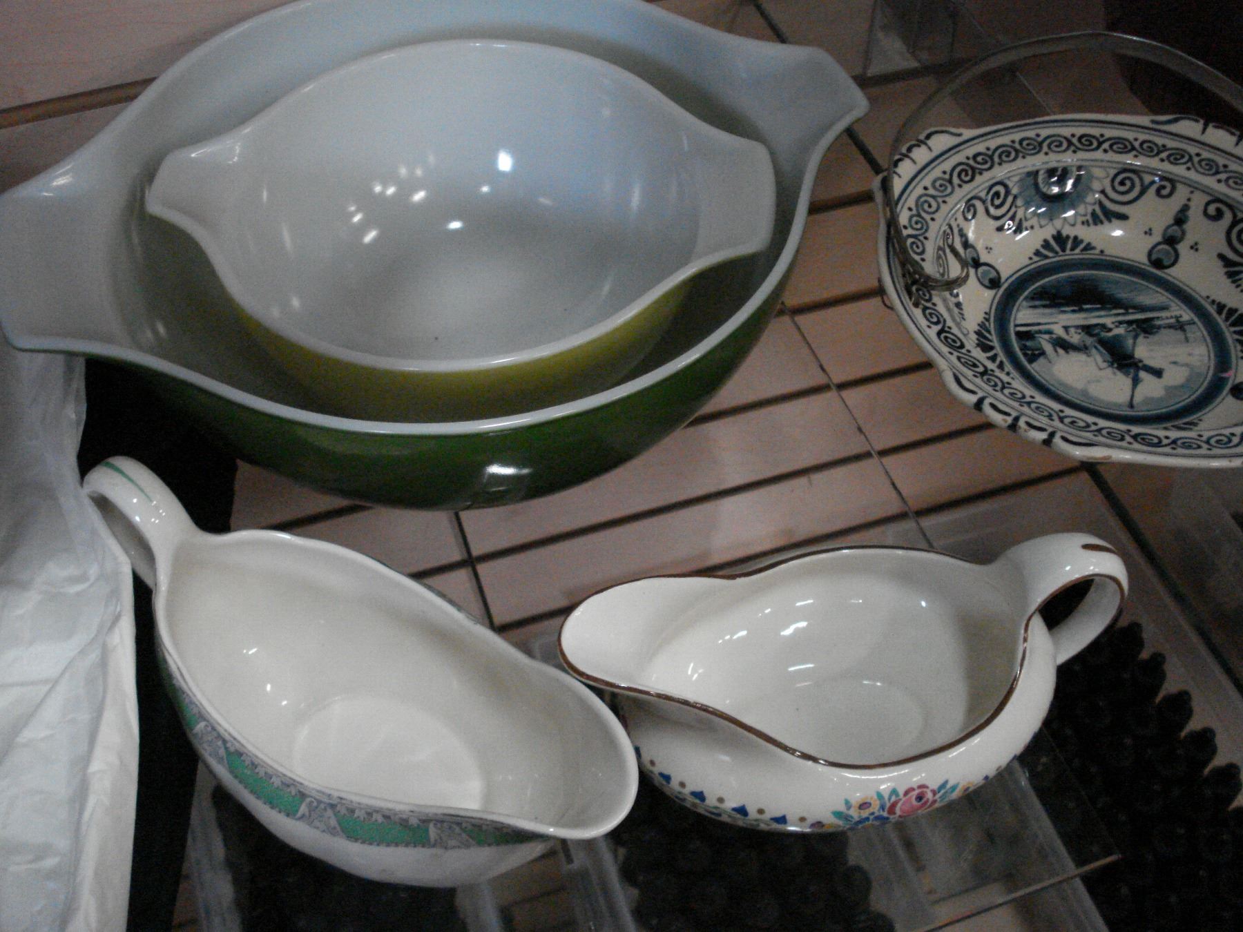 TWO PYREX BOWLS DELFT TRAY AND GRAVY BOATS AND ASSORTED KITCHEN KNIVES