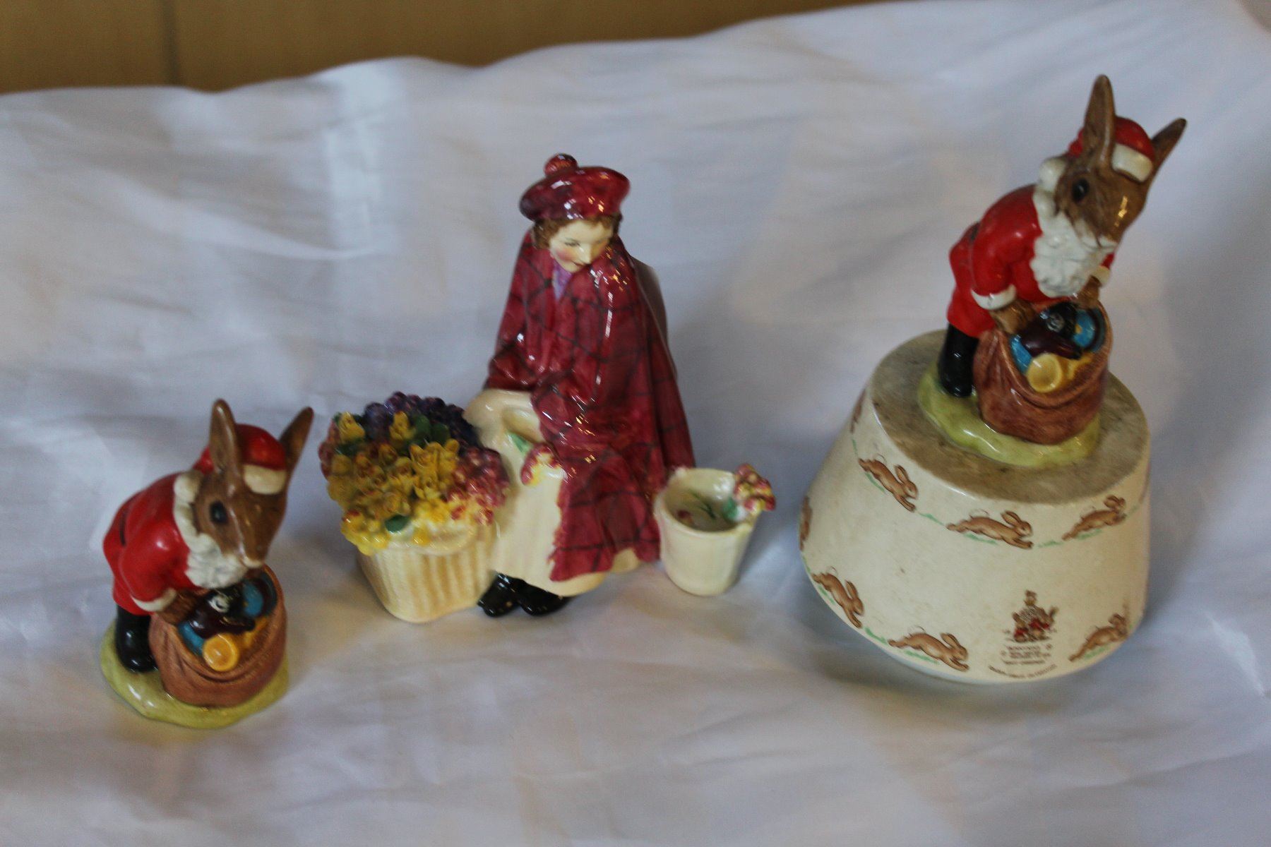 TWO ROYAL DOULTON BUNNYKINS RABBITS ONE IS MUSICAL AND ROYAL DOULTON BONIE LASSIE FIGURE