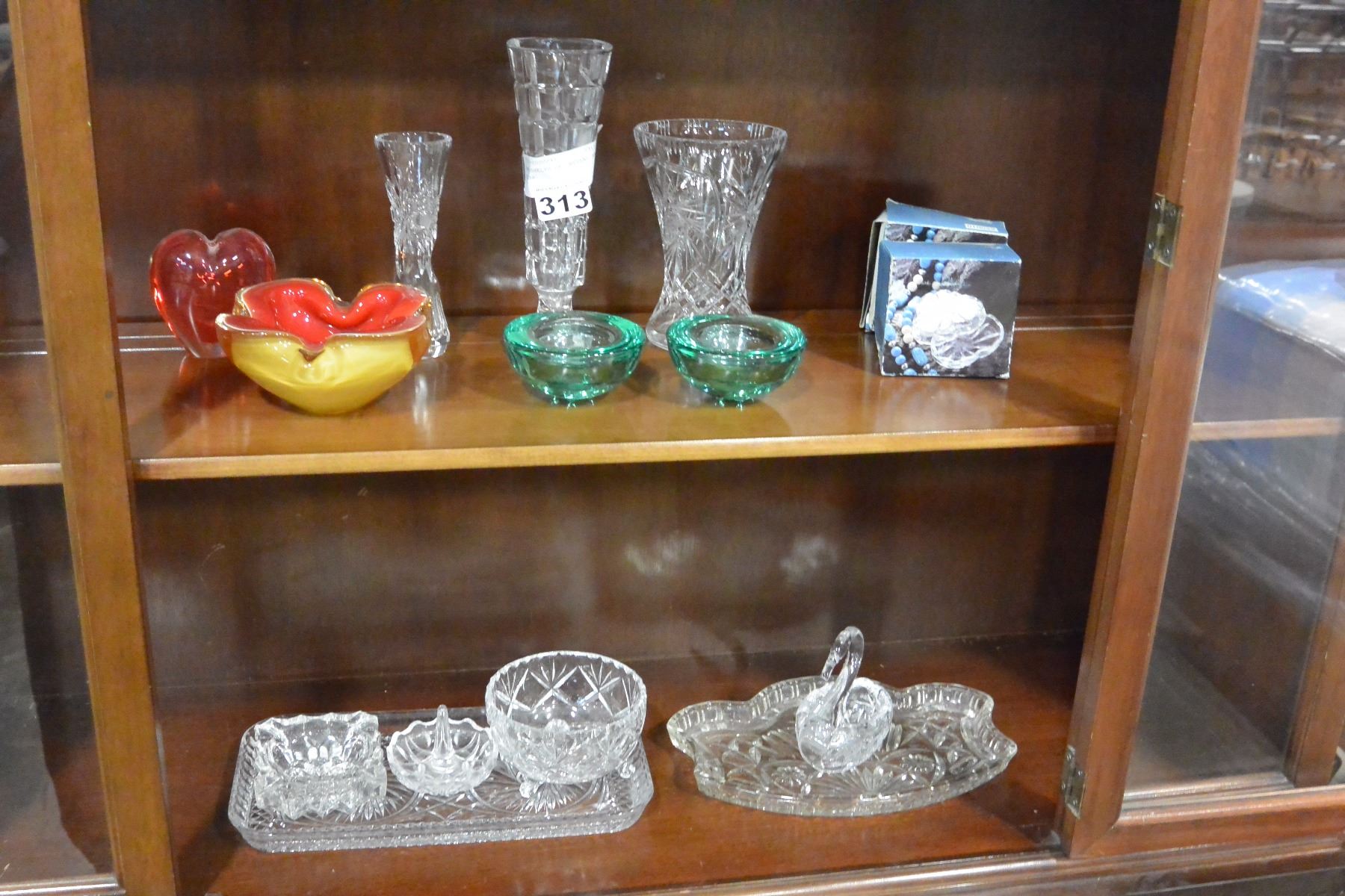TWO SHELFS OF CRYSTAL AND ART GLASS