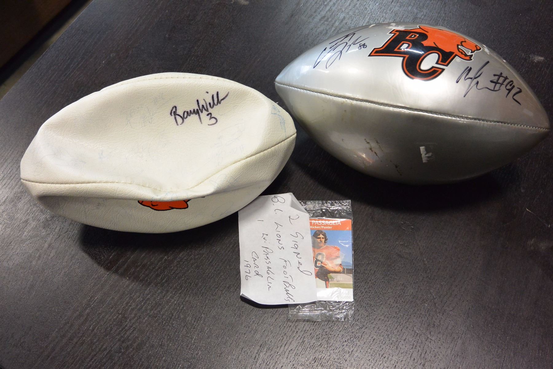 TWO SIGNED BC LIONS FOOTBALLS AND LUI PASSAGLIA CARD