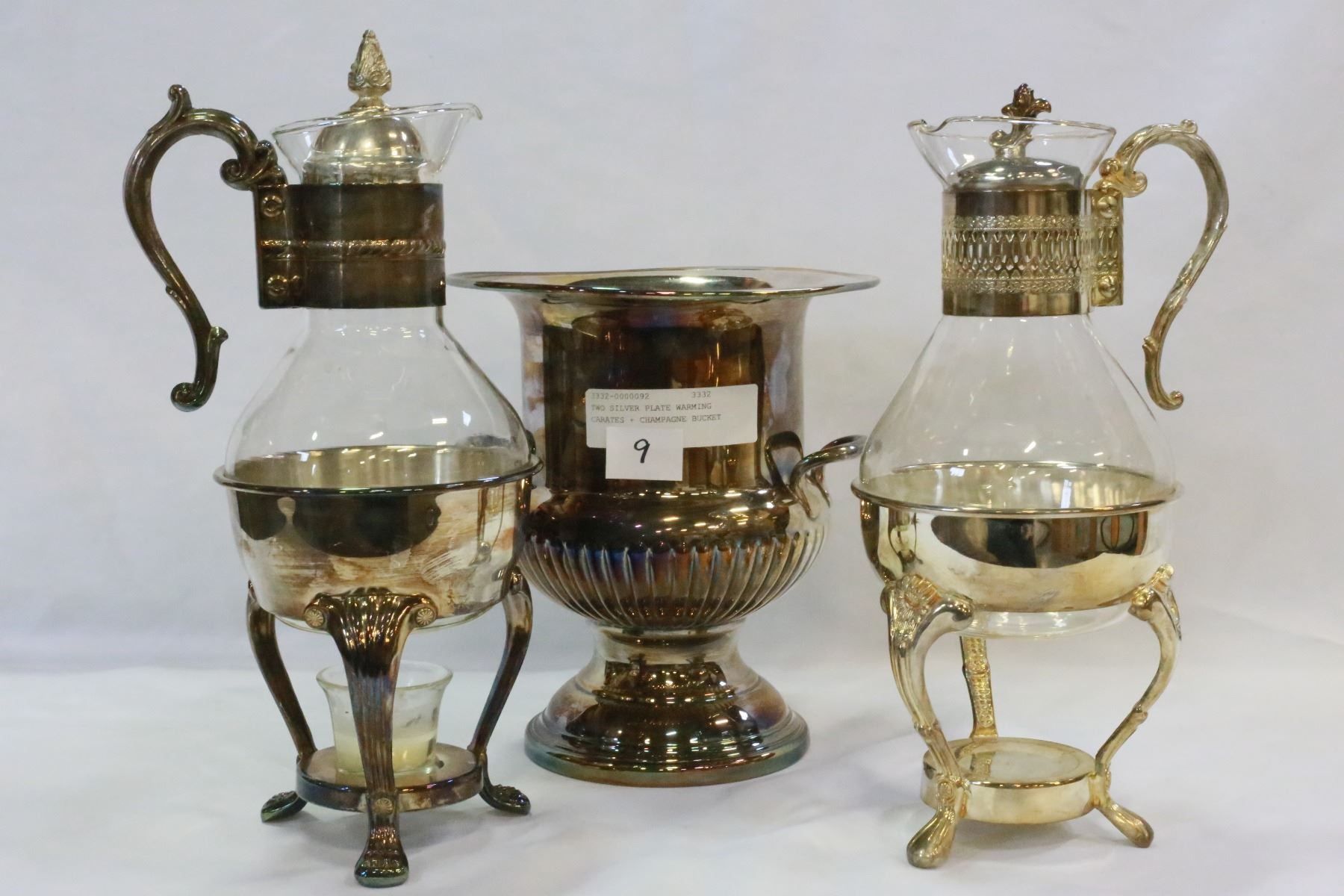 TWO SILVER PLATE WARMING CARATES + CHAMPAGNE BUCKET