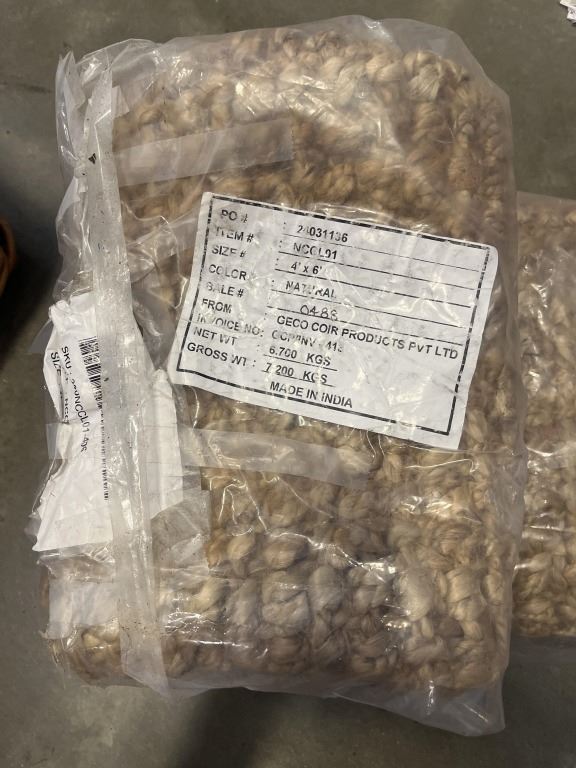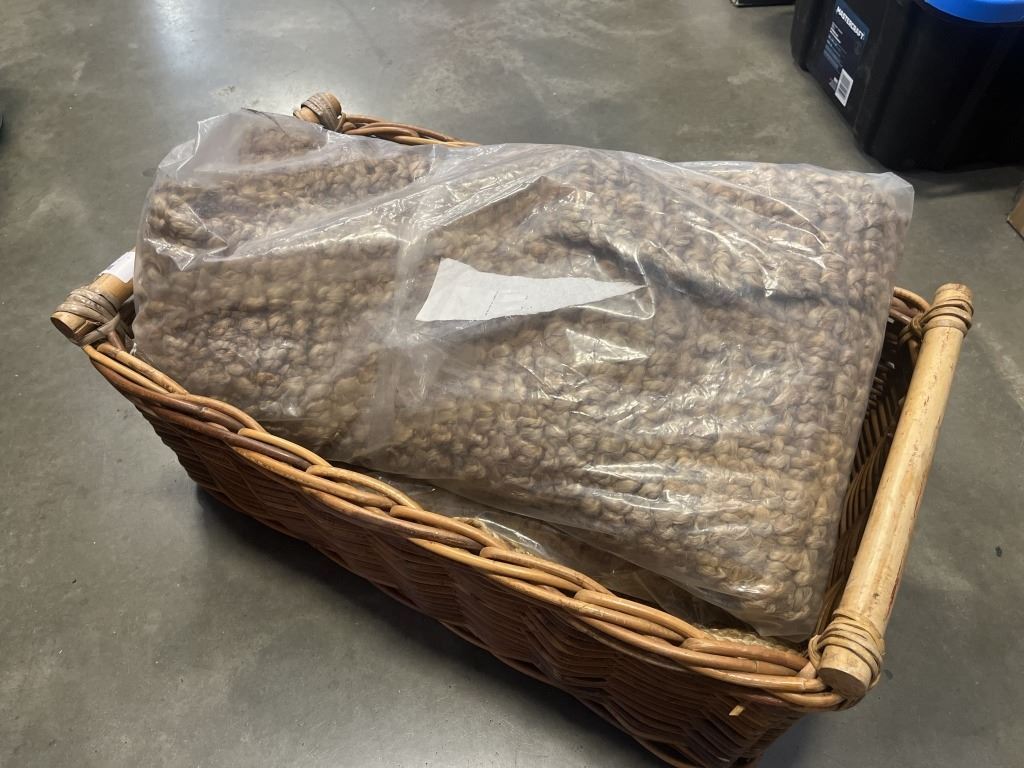 TWO SMALL JUTE AREA CARPETS AND WICKER BASKET