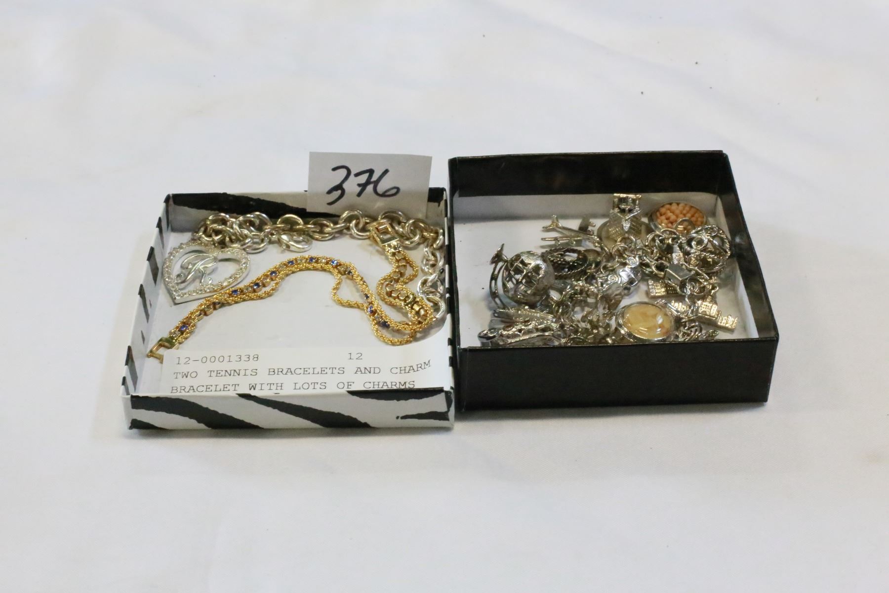 TWO TENNIS BRACELETS AND CHARM BRACELET WITH LOTS OF CHARMS
