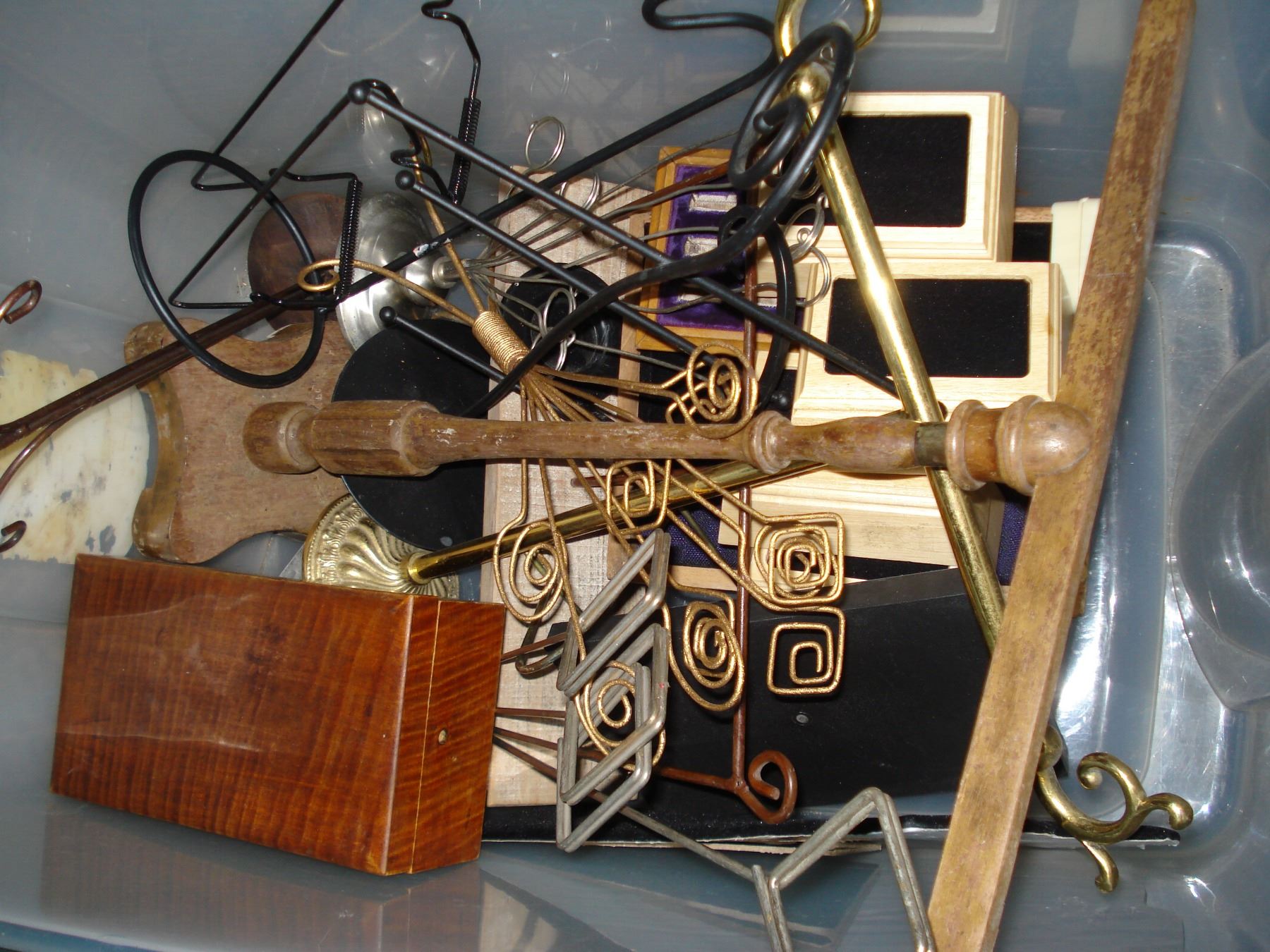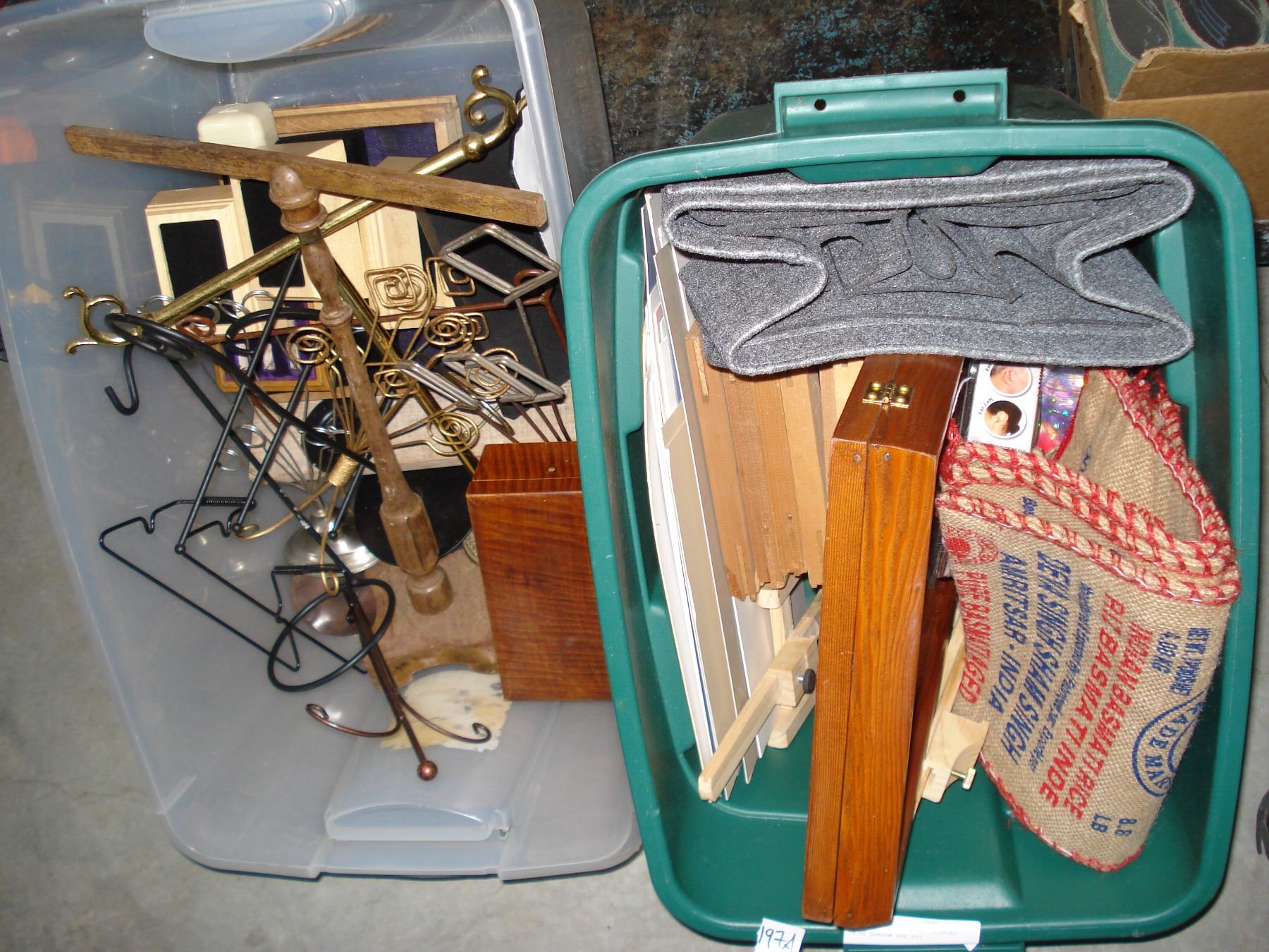 TWO TOTES OF ASSORTED DISPLAY RACKS SHADOW BOX ETC