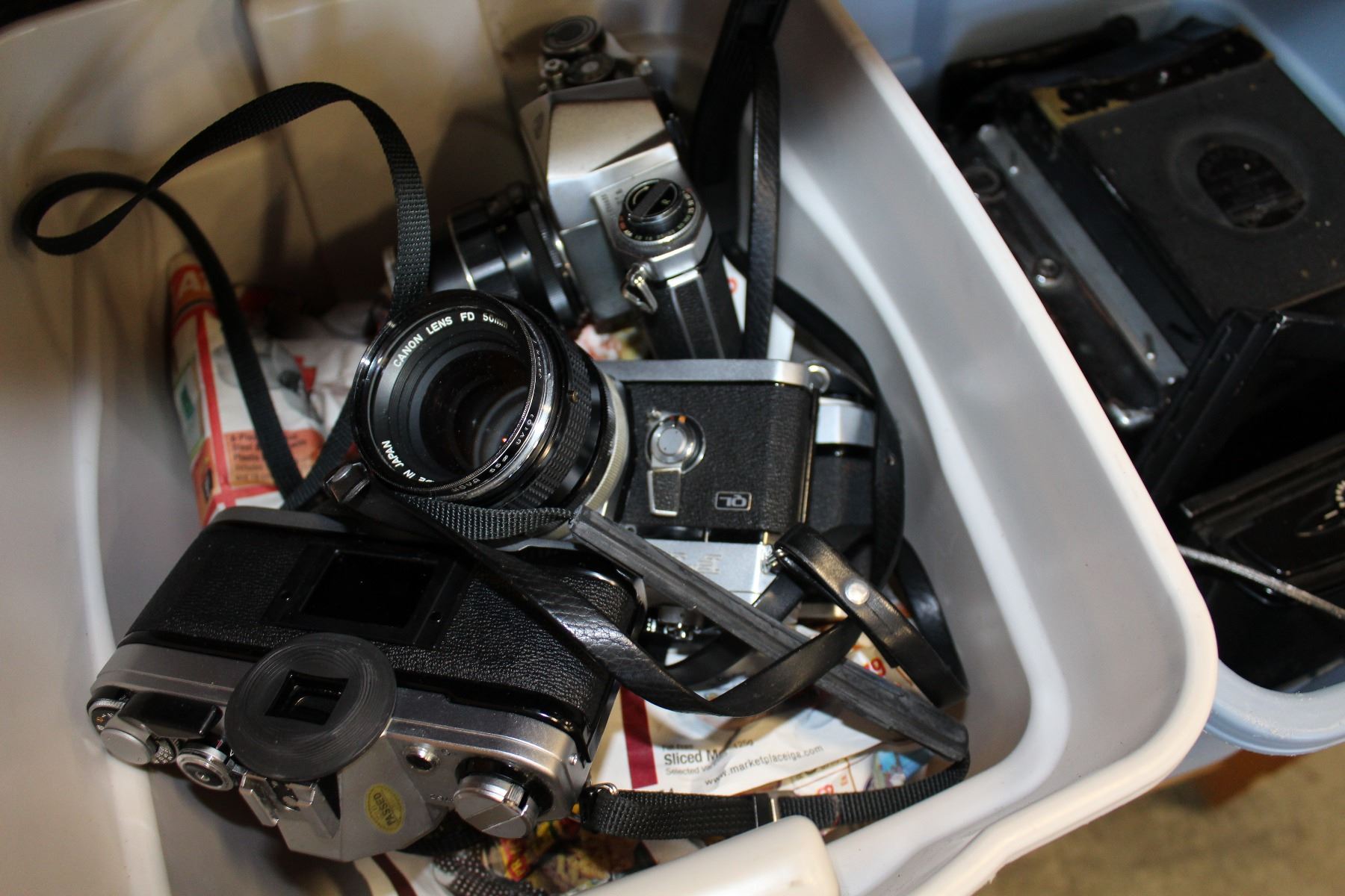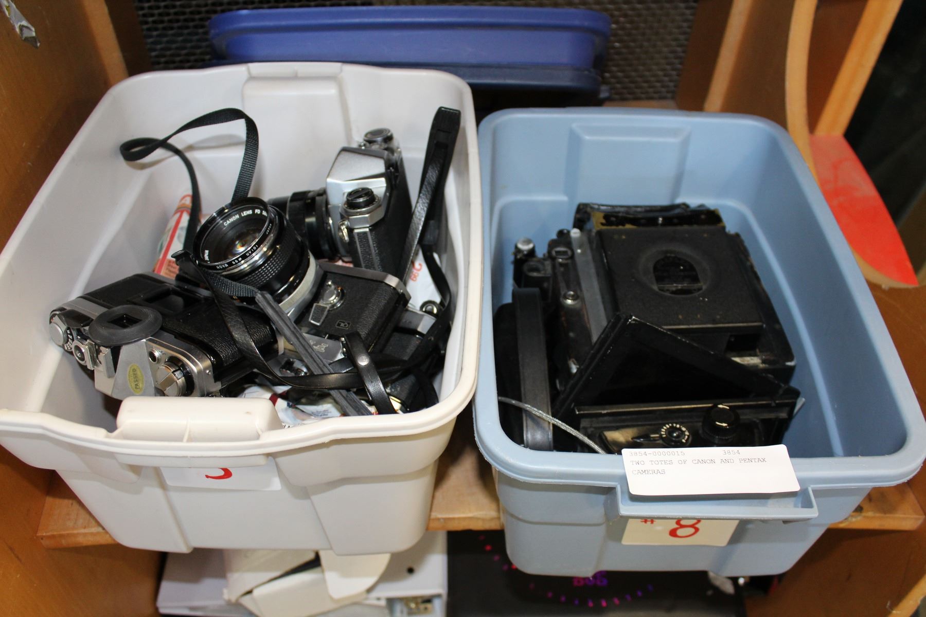 TWO TOTES OF CANON AND PENTAX CAMERAS