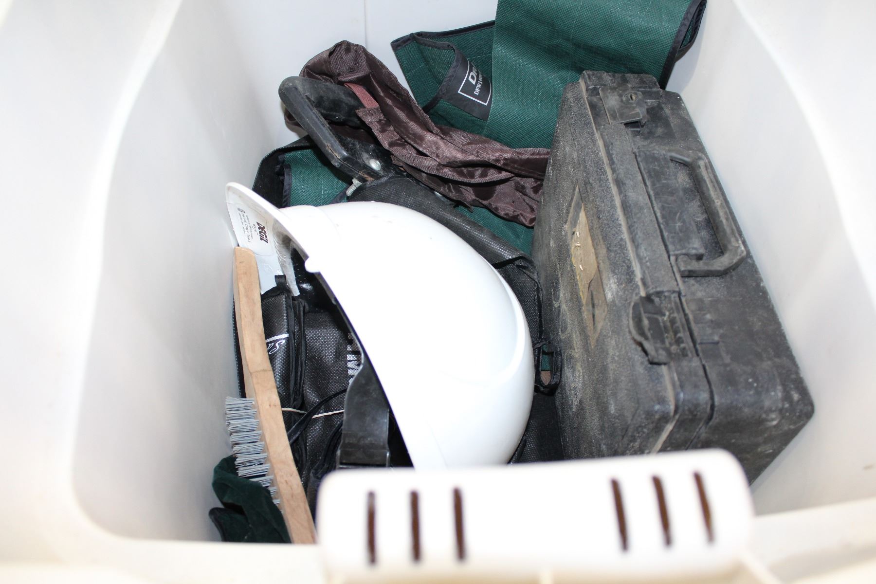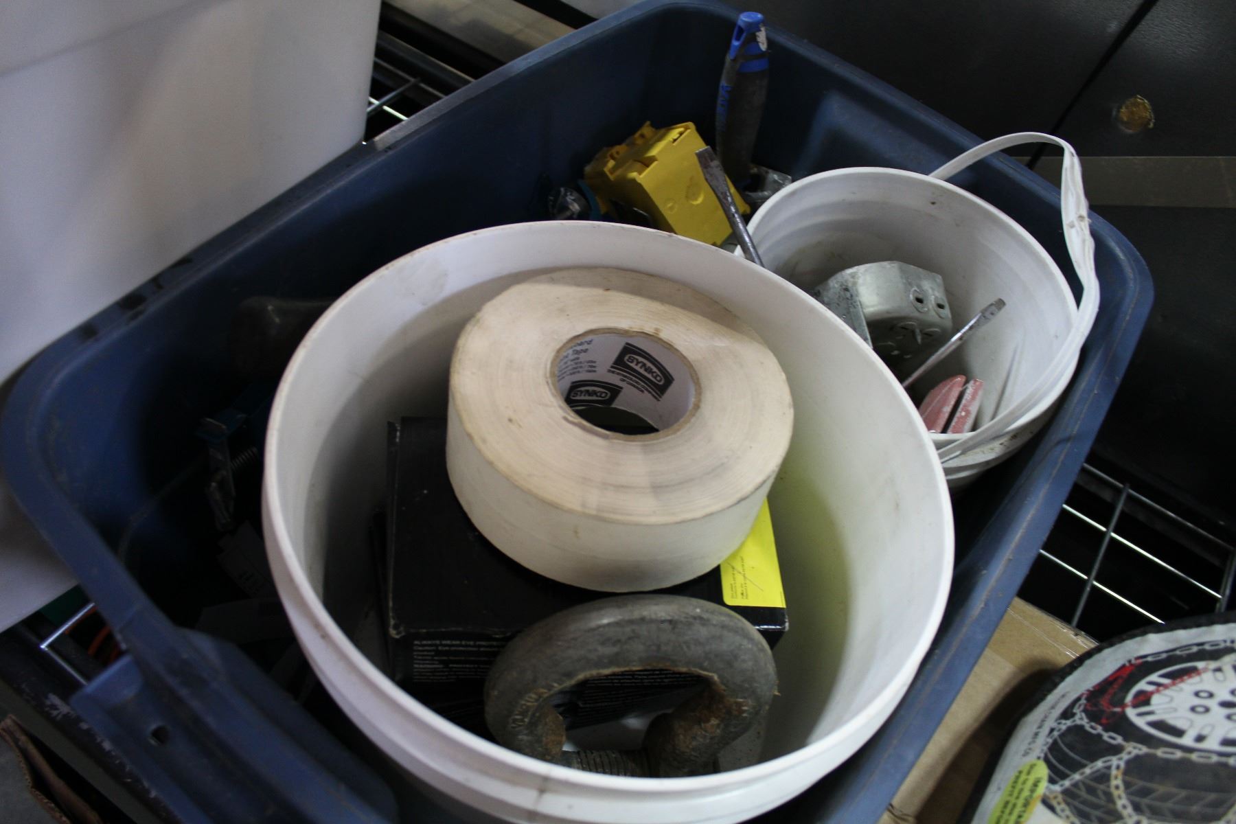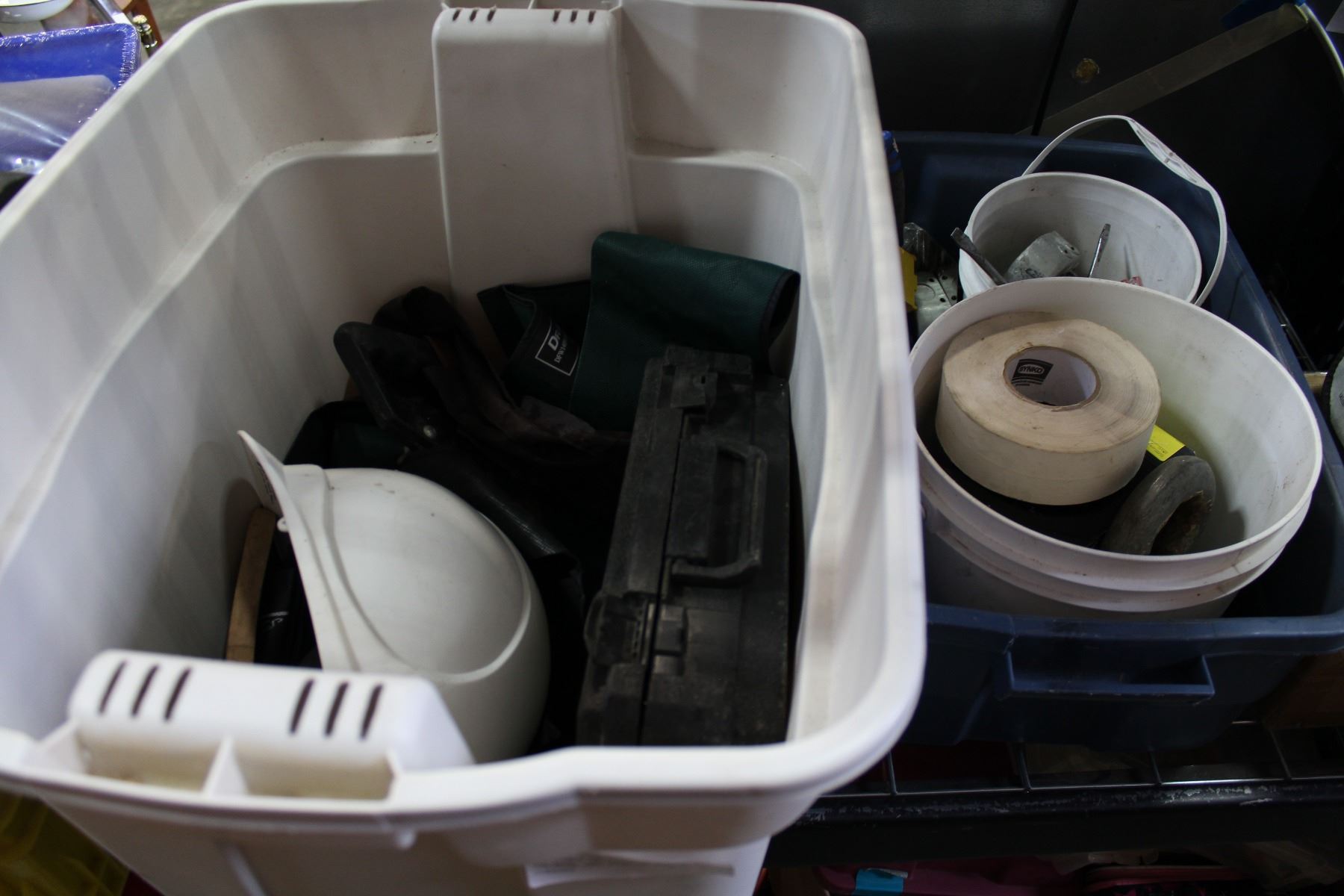 TWO TOTES OF TOOLS AND HARDWARE AND FISHING ROD SLEEVES