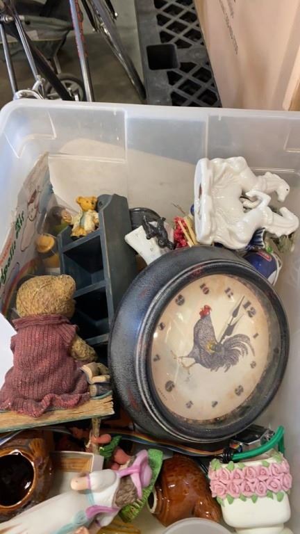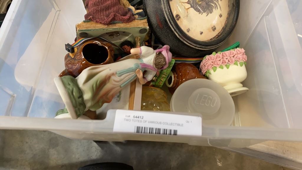 TWO TOTES OF VARIOUS COLLECTIBLE AND BURL CLOCK