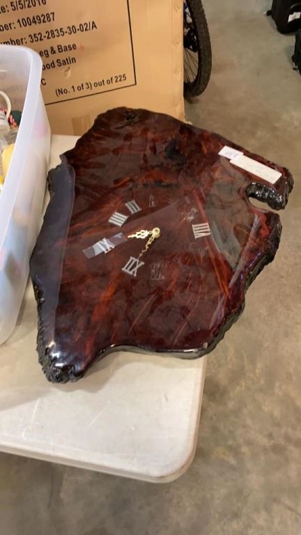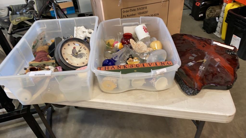 TWO TOTES OF VARIOUS COLLECTIBLE AND BURL CLOCK