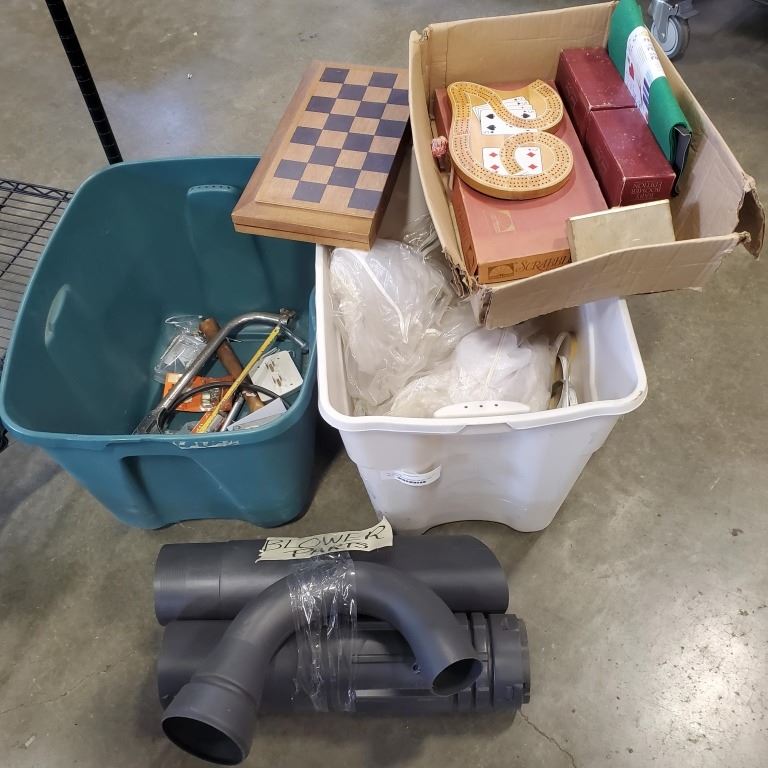 TWO TOTES WITH CONTENTS, VELCRO, HAND TOOLS, BLOWER PARTS, WOODEN CHESS SET AND MORE