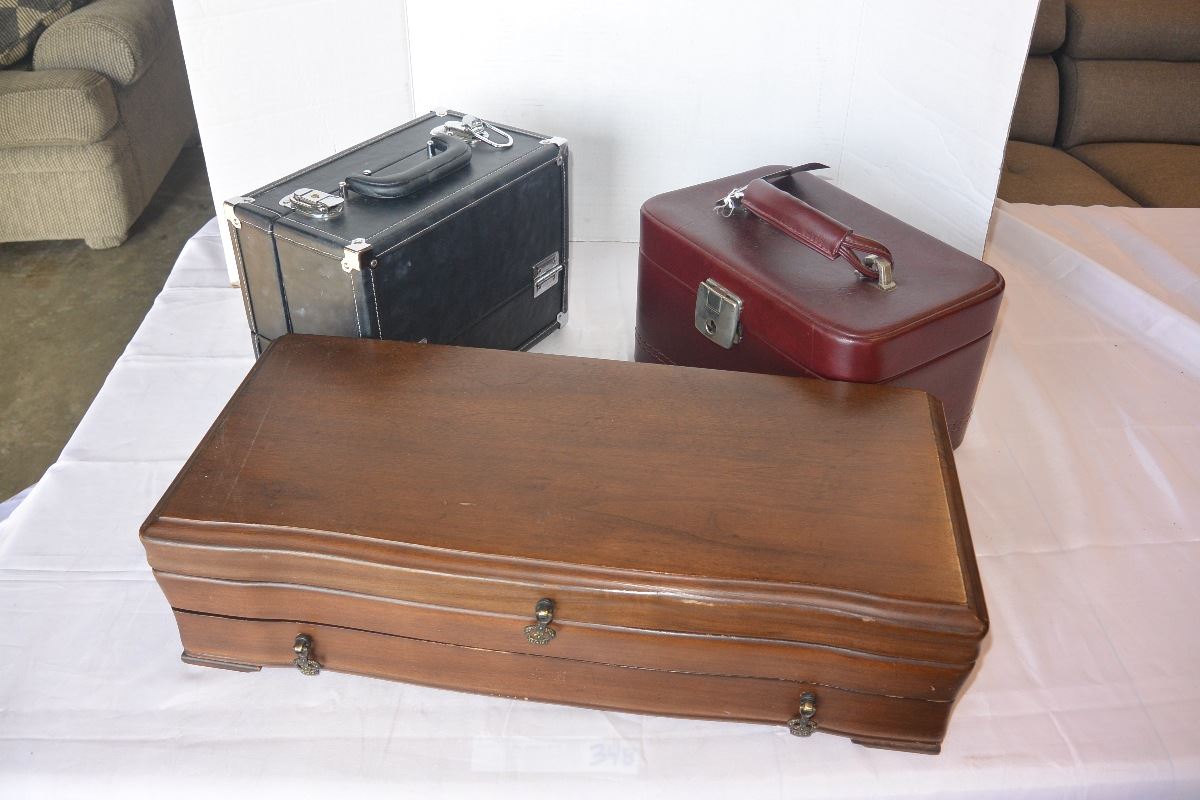 TWO VINTAGE JEWELLRY BOXES AND CUTLERY CANTEEN