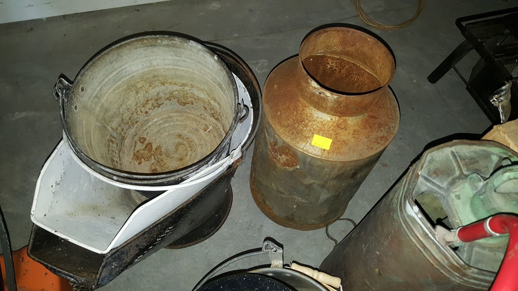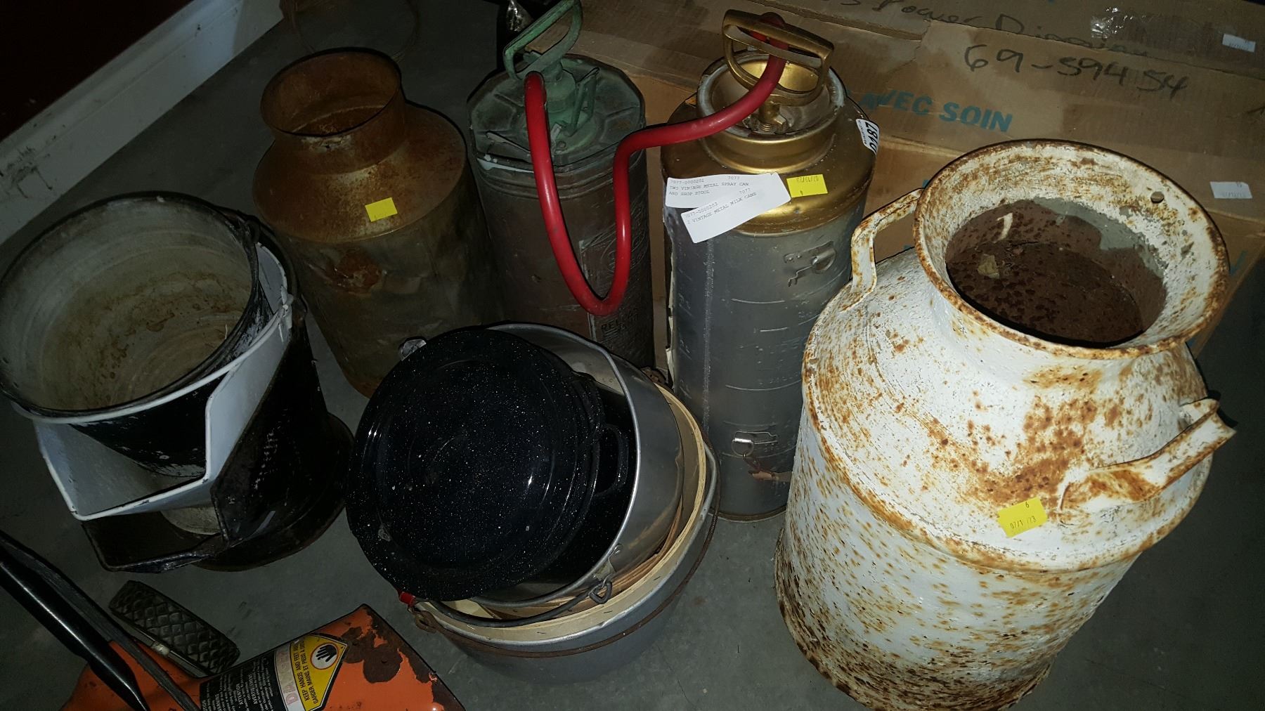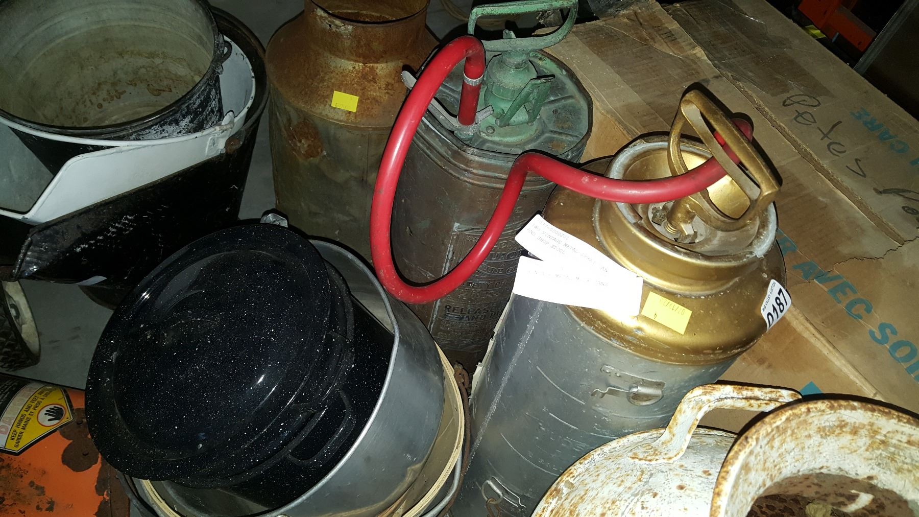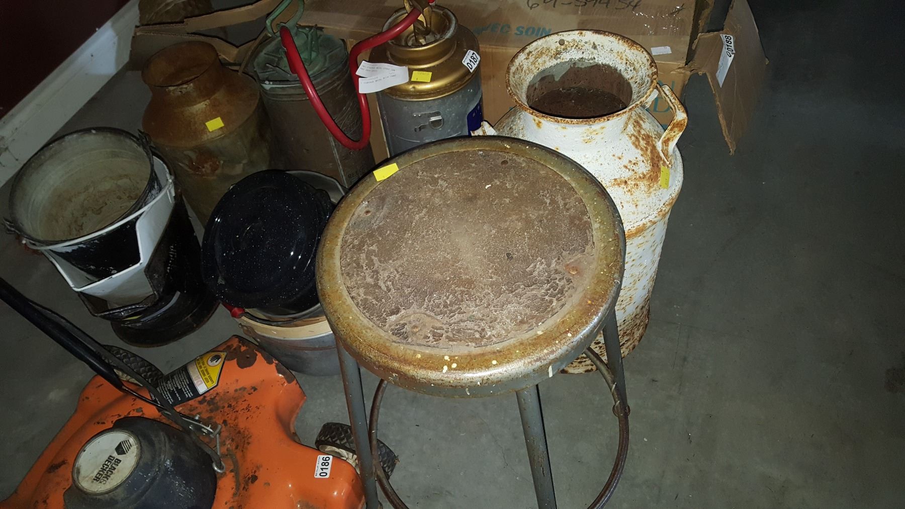 TWO VINTAGE METAL SPRAY CAN AND SHOP STOOL AND 2 VINTAGE MILK CANS