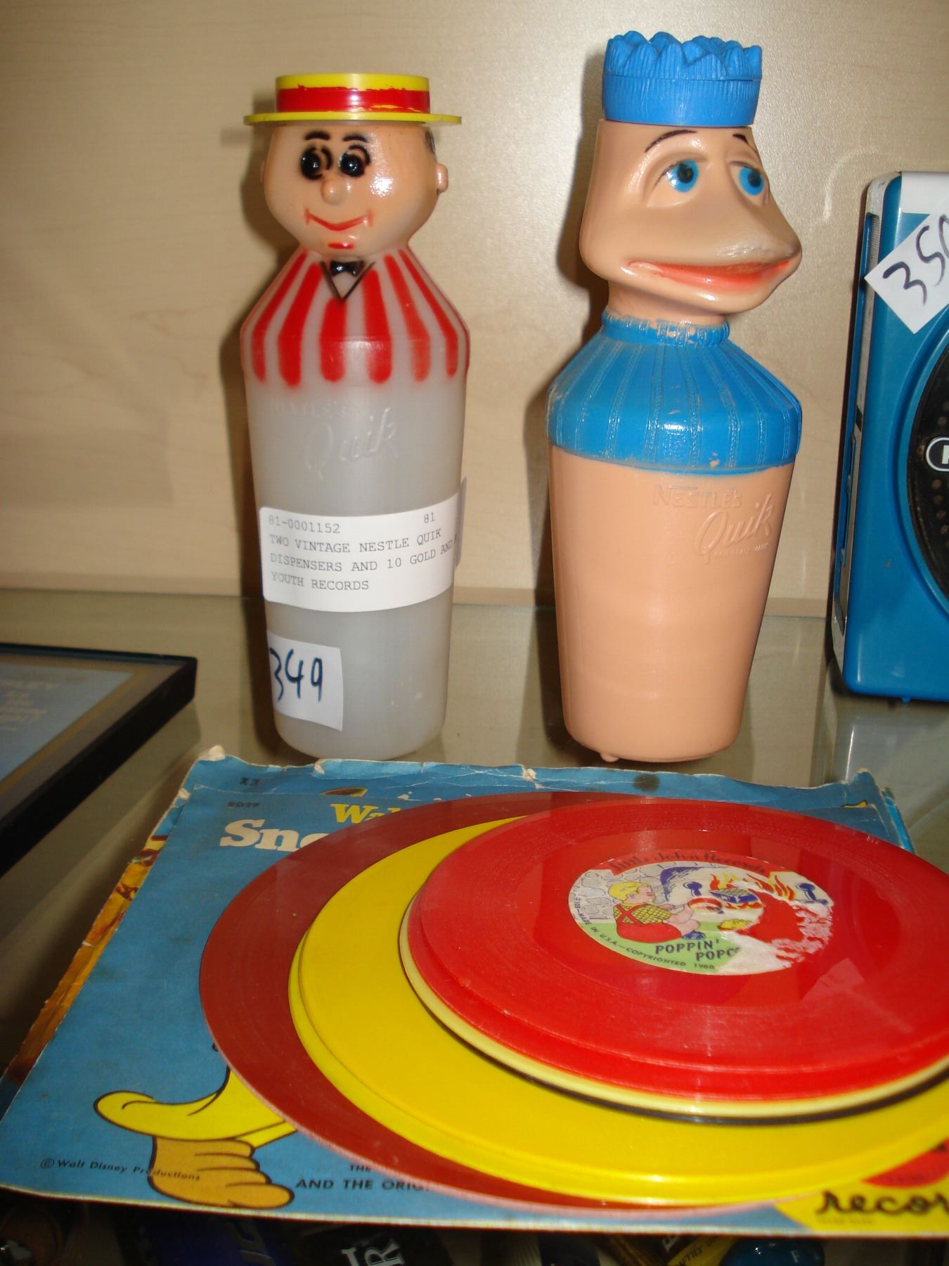 TWO VINTAGE NESTLE QUIK DISPENSERS AND 10 GOLD AND RED YOUTH RECORDS