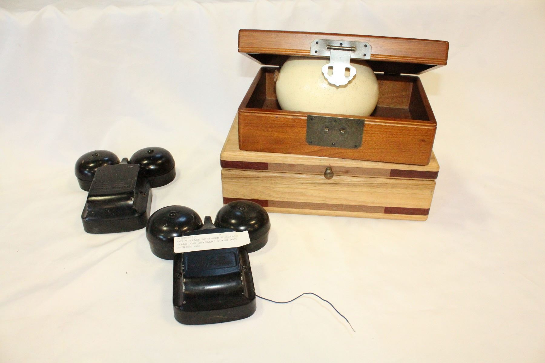 TWO VINTAGE NORTHERN ELECTRIC BELLS AND JEWELLRY BOXES AND OSTRICH EGG