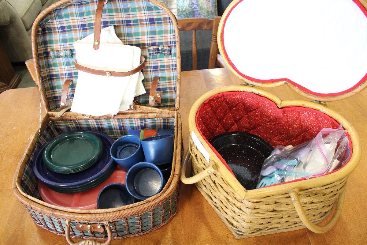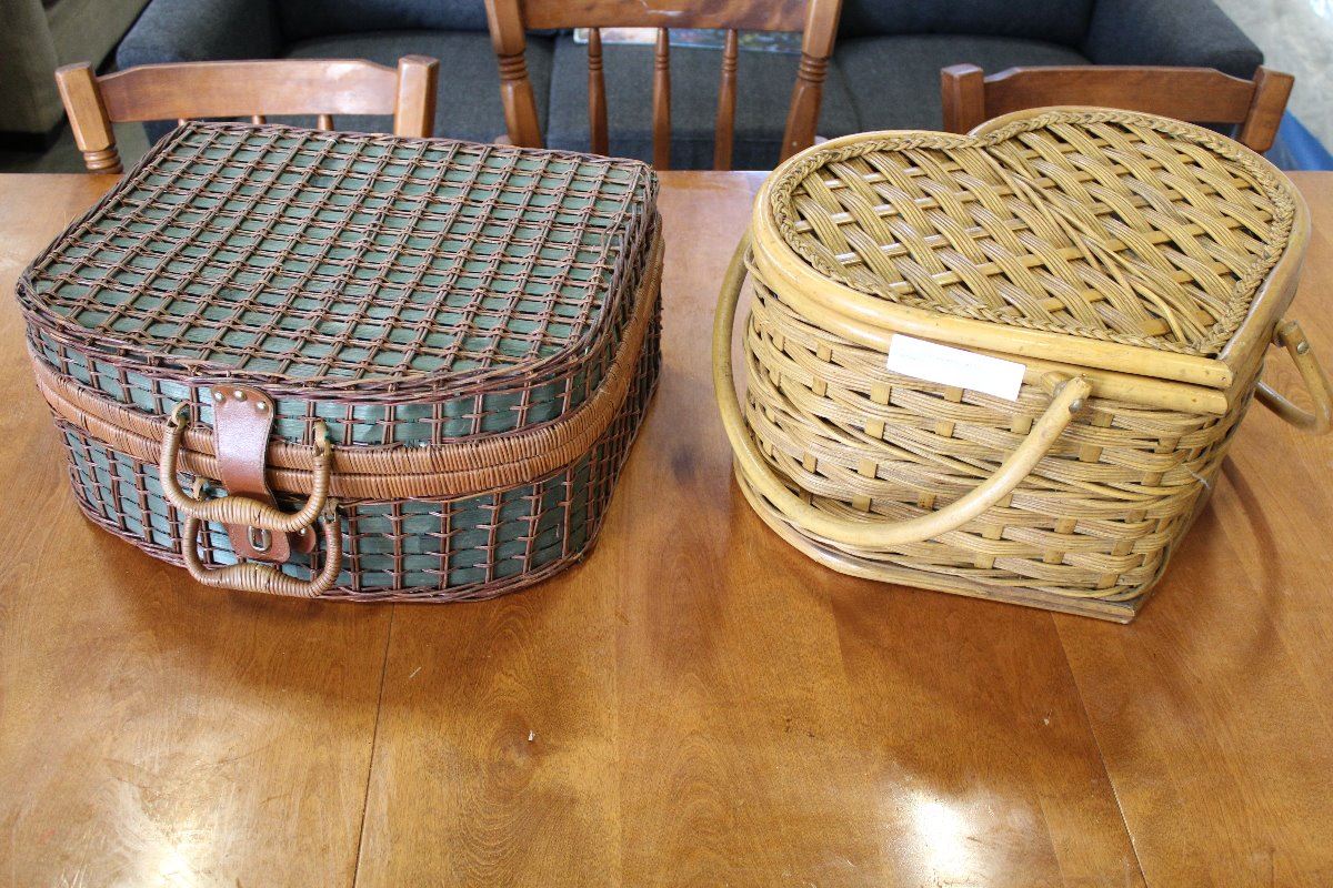 TWO WICKER BASKETS WITH CONTENTS