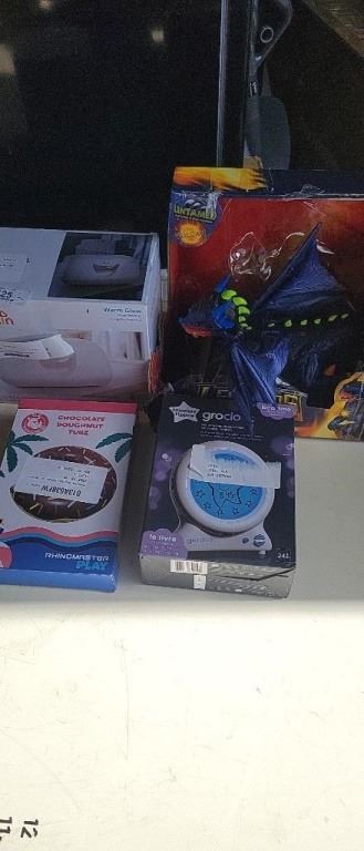 Tommee tippee grow clock, chocolate donut tube, munchkin wipe warmer and untamed Vulcan dragon