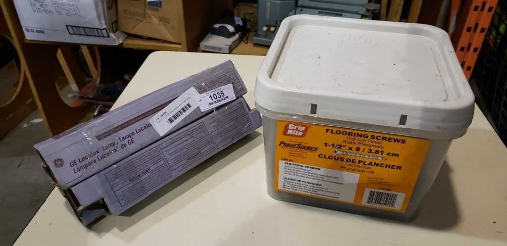 Tub of 1-1/2" flooring screws and 3 light bulbs