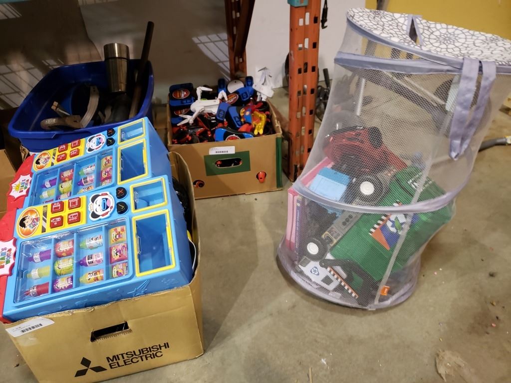 Two boxes and hamper of toys