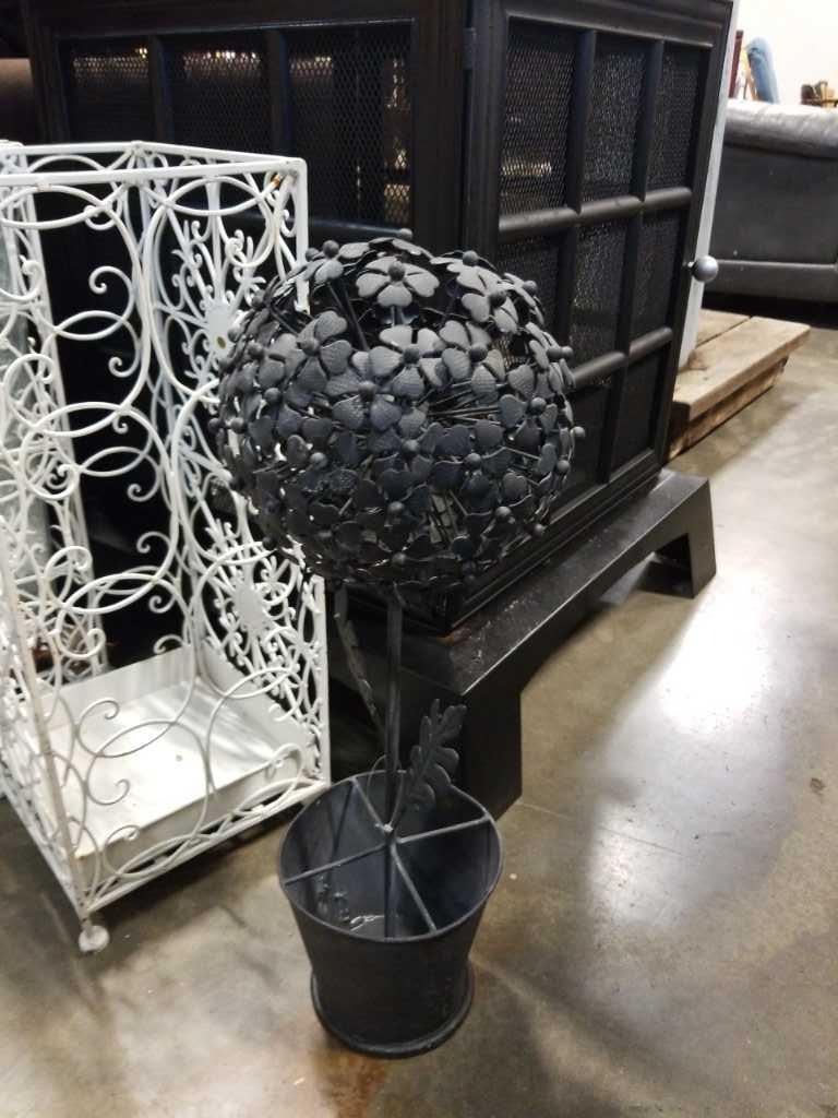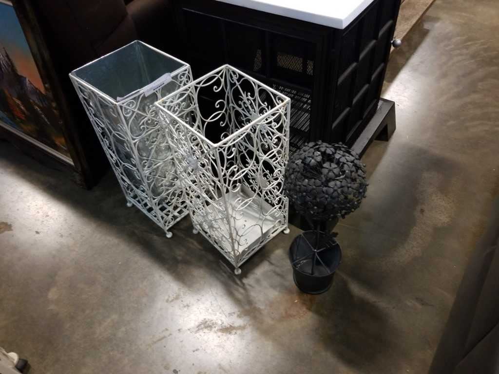 Two decorative metal umbrella stands and metal plant