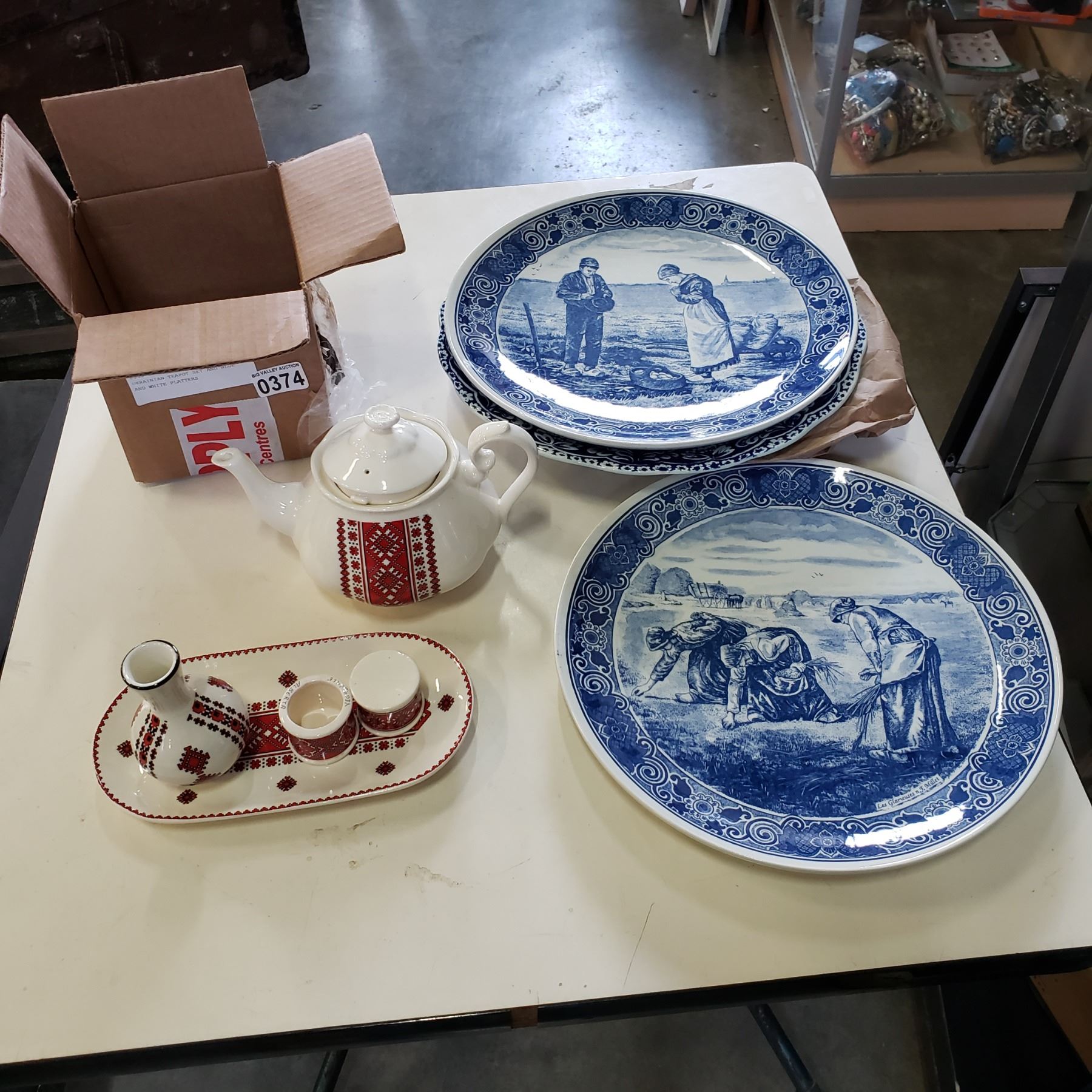 UKRAINIAN TEAPOT SET AND BLUE AND WHITE PLATTERS