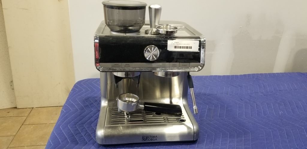 UNUSED, STORE DISPLAY DEMO ULTIMA COSA PRESTO BOLLENTE ESPRESSO MACHINE W/ FROTHER AND COFFEE GRINDER - TESTED WORKING, RETAIL $299
